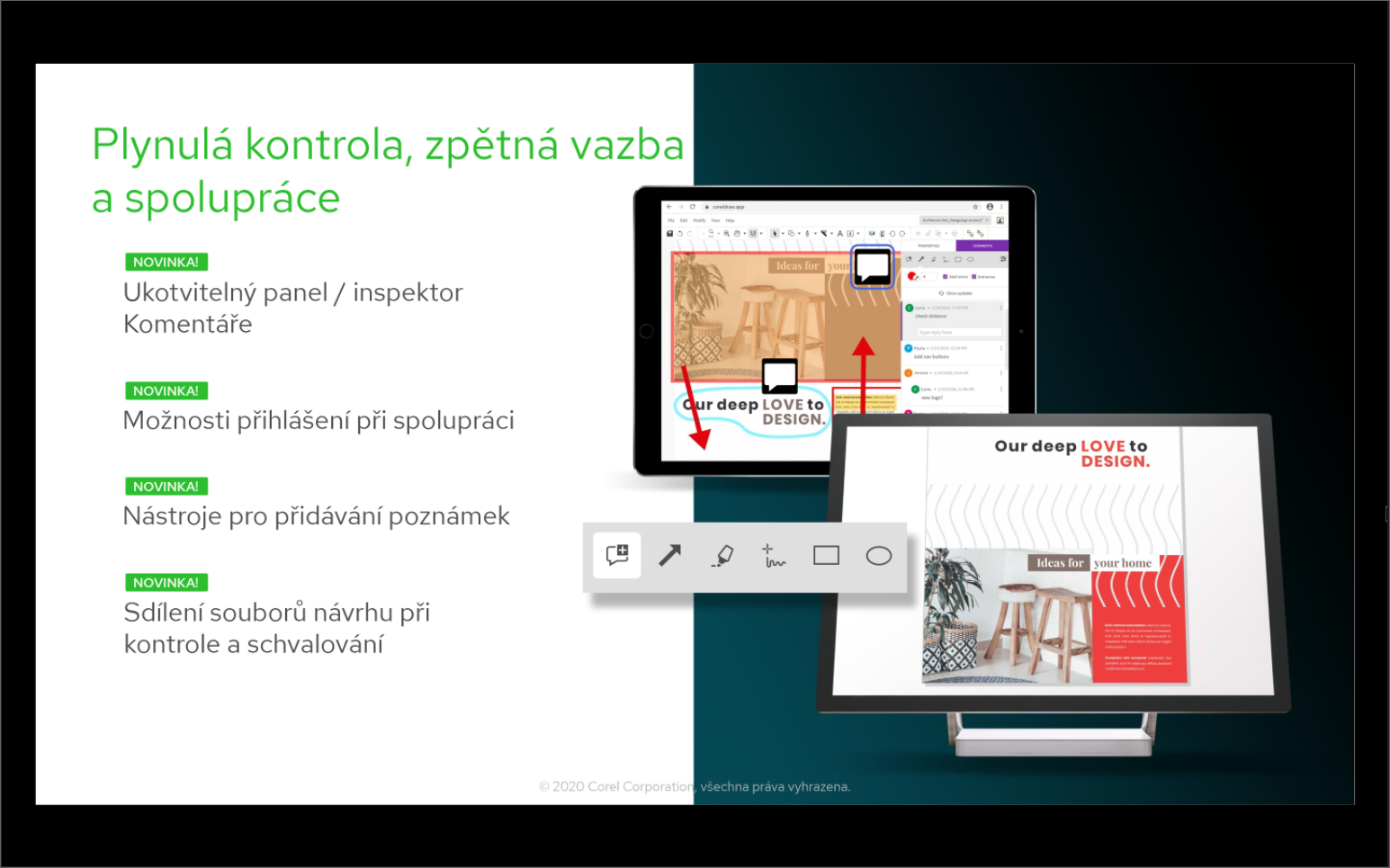 - Komentáre a poznámky: S novým ukotvitelným panelom/inšpektorom sú všetci tvorcovia projektu v jednom čase čas na rovnakej úrovni projektu. Pridanie podrobných komentárov a poznámok, vrátane šípok, obdĺžnikov, elíps a rovných aj ručne kreslených čiar, priamo do dokumentu šetrí čas i miesto na obrazovke.