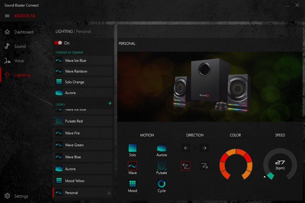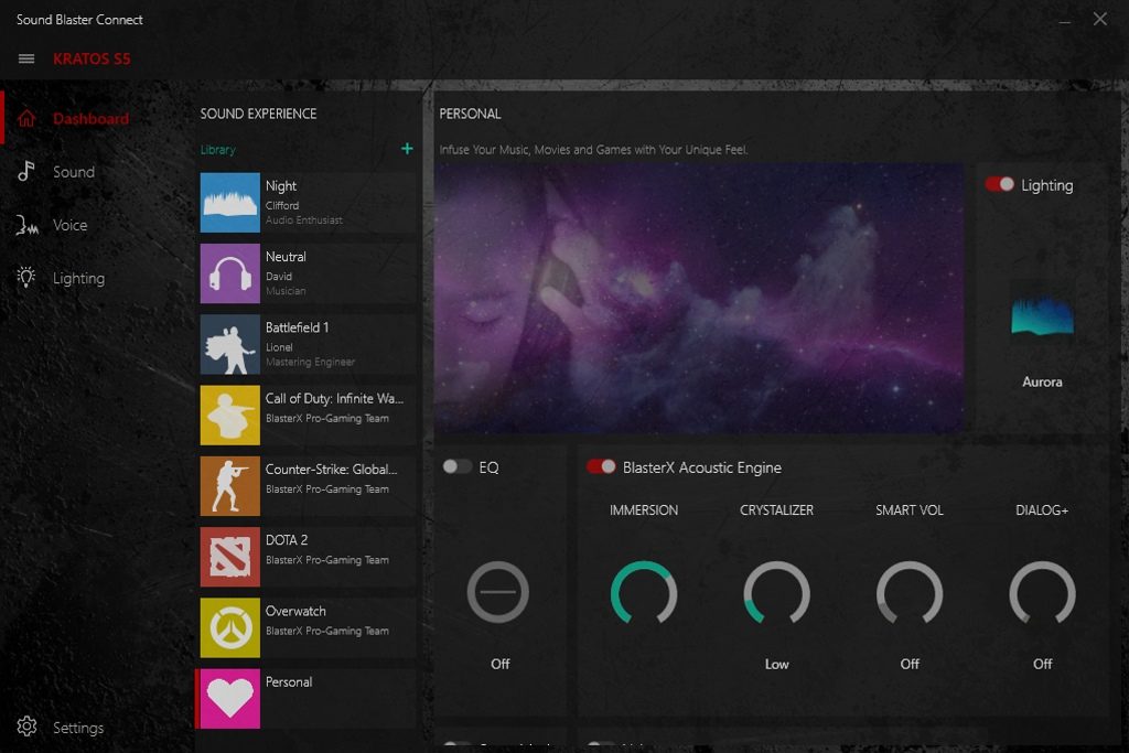 Ladenie zvuku a svetiel sa realizuje cez softvér Sound Blaster Connect. Obsahuje predvoľby na úpravu zvuku cez ekvalizér, samostatne na úpravu basov a výšok. Ekvalizér si vlastne doslova nakreslíte. Stačí stlačiť tlačidlo myši na grafe a prejsť z jednej strany na druhú v požadovanej krivke.