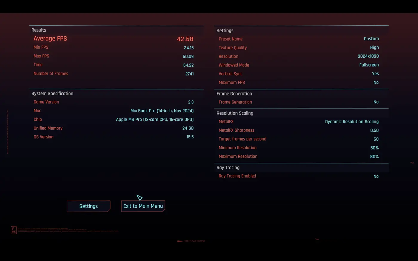 Hru som skúšal na MacBooku Pro s čipom M4 Pro. V benchmark teste v režime na batériu som dosiahol 64,4 fps v prípade odporúčaného nastavenia. Keď som zmenil rozlíšenie z 1800 × 1125 pixelov na 3024 × 1890 pixelov (natívne rozlíšenie displeja daného MacBooku), výsledok bol 42,7 fps.