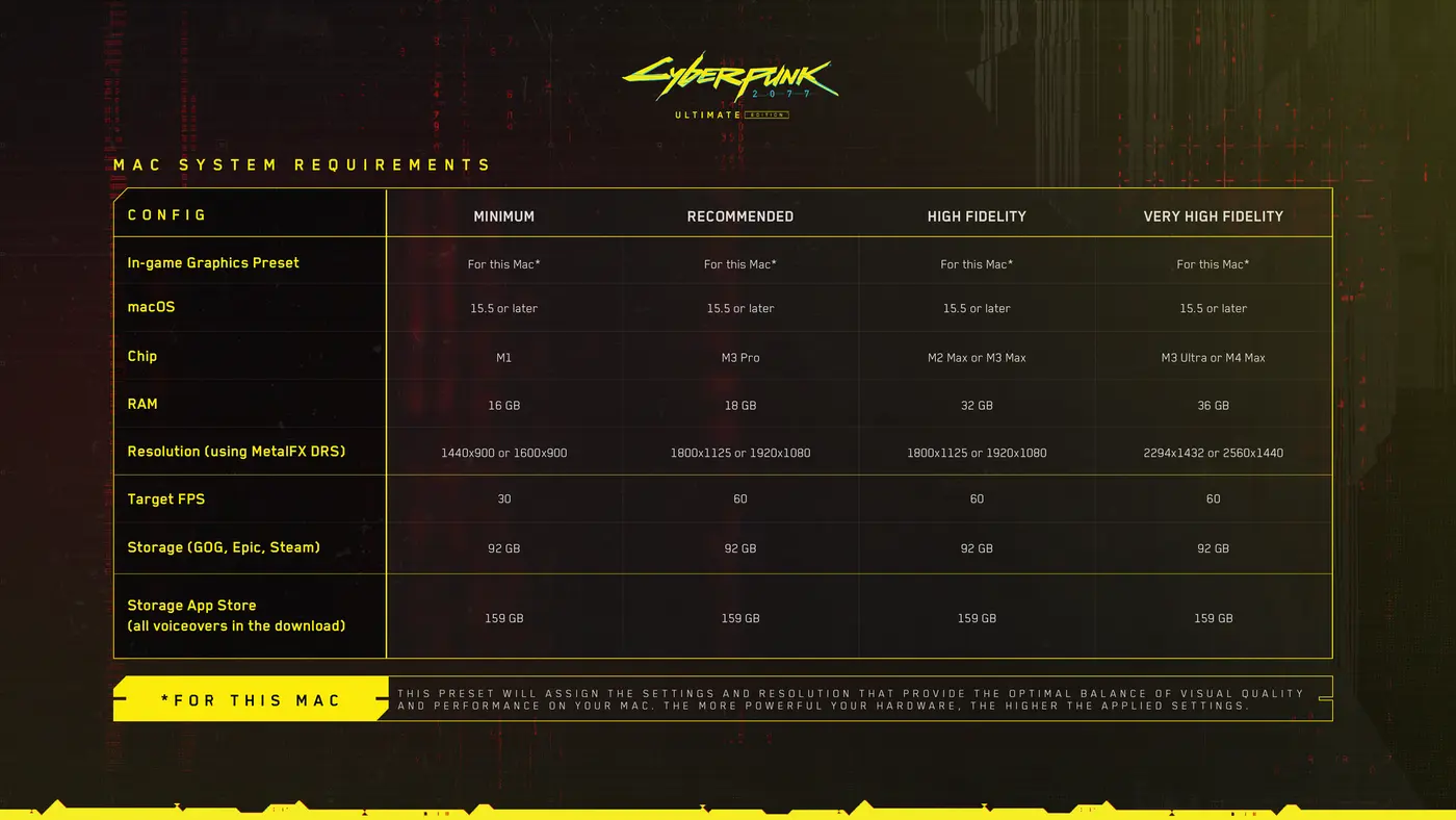Cyberpunk 2077: Ultimate Edition obsahuje základnú hru aj rozšírenie Phantom Liberty. Hra naplno využíva čipy Apple a technológiu Metal. Ponúka vysoký výkon, detailnú grafiku a plynulé hranie. K fungovaniu vyžaduje Mac s čipmi Apple so 16 GB RAM alebo väčšou unifikovanou pamäťou. Najlepší herný zážitok poskytuje systém macOS 15.5 alebo novší.