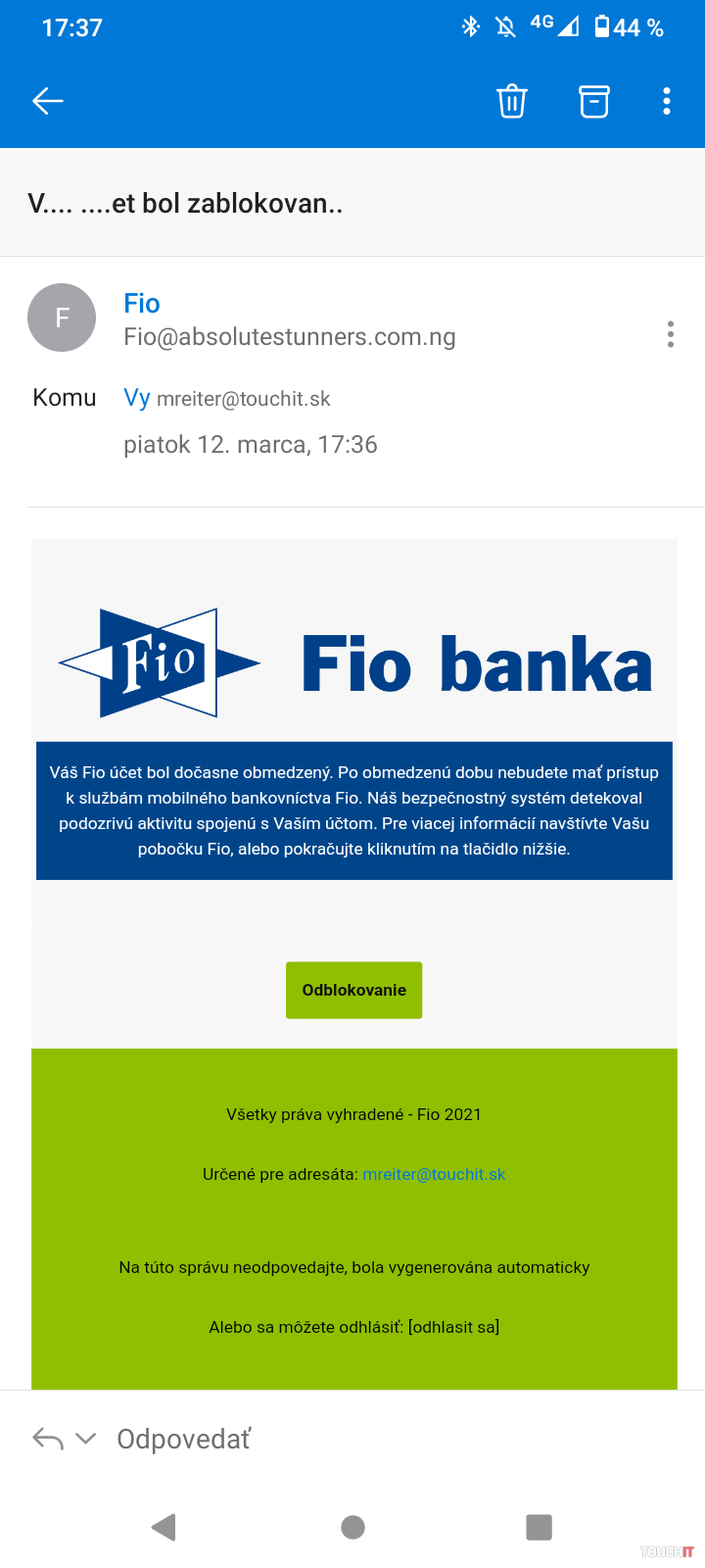 Tento raz sa cieli na banku FIO banka. Emailová správa, ktorú sme obdržali v schránke nebude ojedinelá. Správ podobného charakteru sa objavujú aj v prípade iných bánk. Útočníci idú až tak ďaleko, že napodobňujú dizajn domovskej stránky konkrétnej banky. Zámienky bývajú rôzne, niekedy ide o potvrdenie údajov, inokedy zase o potrebu vyplniť chýbajúce údaje. Variantov je vždy niekoľko a útočníci skúšajú vždy niečo nové. Ak vás nenalákajú na vrátanie nejakého preplatku vašej osobe, tak skúšajú napríklad obmedzenie či blokovanie účtu. Dočasné a ste to vy, kto musí potvrdiť nejaké údaje, aby vám banka účet odomkla. To isté sa deje aj pri emaily FIO banky. V emailovej správe sa uvádza, že máte dočasne obmedzený prístup k účtu z dôvodu podozrivej aktivity. Email je veľmi dobre vytvorený. Gramaticky správne, vo farbách FIO banky, no má to jeden háčik. Odosielateľ Fio@absolutestunners.com.ng nebude oficiálny účet tejto banky. Štandardne sa ale v mobilnej aplikácii Microsoft Outlook hlavička emailu nezobrazuje kompletná. Treba na ňu ťuknúť a ukážu sa aj emailové adresy. V našom prípade by to aj bez informácií z hlavičky správy bolo jednoduché. FIO banku nepoužívame, no ak by sa podvod týkal nami využívanej banky, bolo by to uveriteľnejšie. Avšak vždy skontrolujte hlavičku správy, tá vám jasne napovie, či ide o podvod alebo nie. Len pre úplnosť, doména prvej úrovne NG patrí Nigérii.