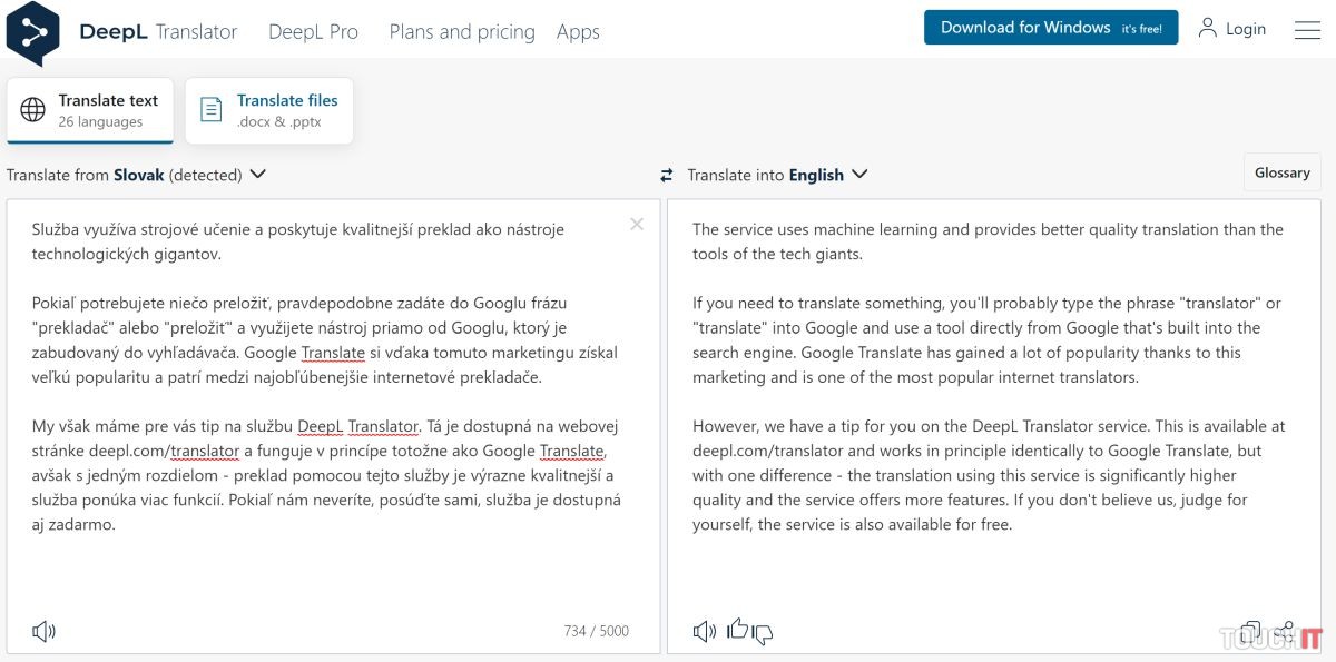 Pokiaľ potrebujete niečo preložiť, pravdepodobne zadáte do Googlu frázu „prekladač“ alebo „preložiť„ a využijete nástroj priamo od Googlu, ktorý je zabudovaný do vyhľadávača. Google Translate si vďaka tomuto marketingu získal veľkú popularitu a patrí medzi najobľúbenejšie internetové prekladače. My však máme pre vás tip na službu DeepL Translator. Tá je dostupná na webovej stránke deepl.com/translator a funguje v princípe totožne ako Google Translate, avšak s jedným rozdielom – preklad pomocou tejto služby je výrazne kvalitnejší a služba ponúka viac funkcií. Pokiaľ nám neveríte, posúďte sami, služba je dostupná aj zadarmo.