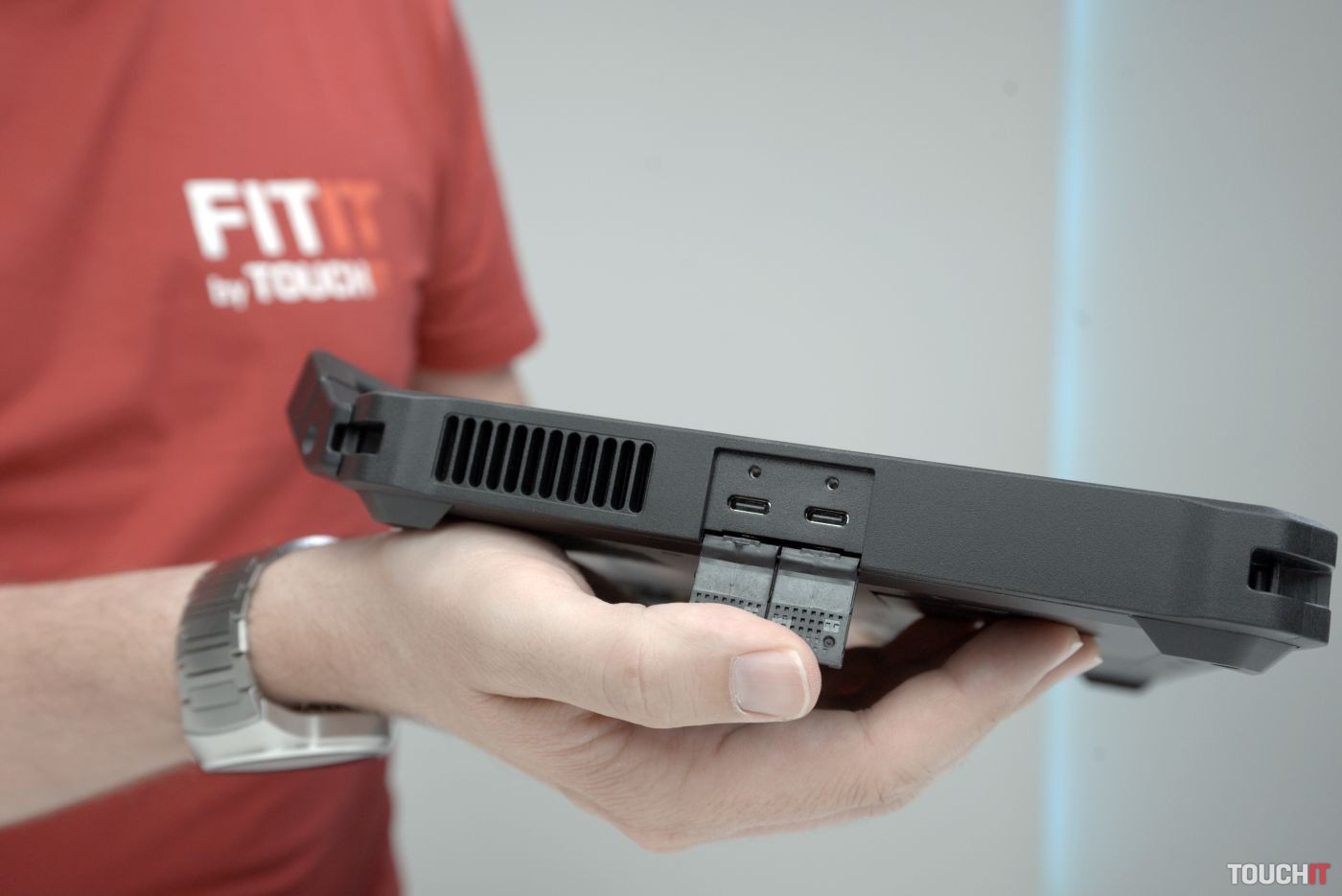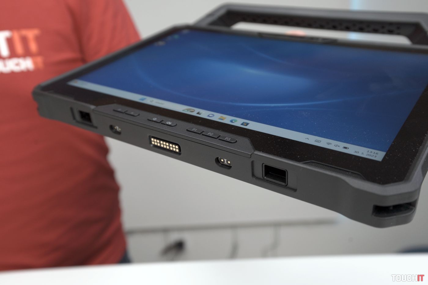 Dell Latitude 7230 Rugged Extreme Tablet obsahuje aj zabudovanú rukoväť pre pohodlnejšie prenášanie. V prípade potreby ju môžete odpojiť – treba ju odskrutkovať. Jednotlivé porty sú chránené gumovými krytmi, ktoré zabezpečujú už spomenutú odolnosť voči vode a prachu na úrovni IP65.