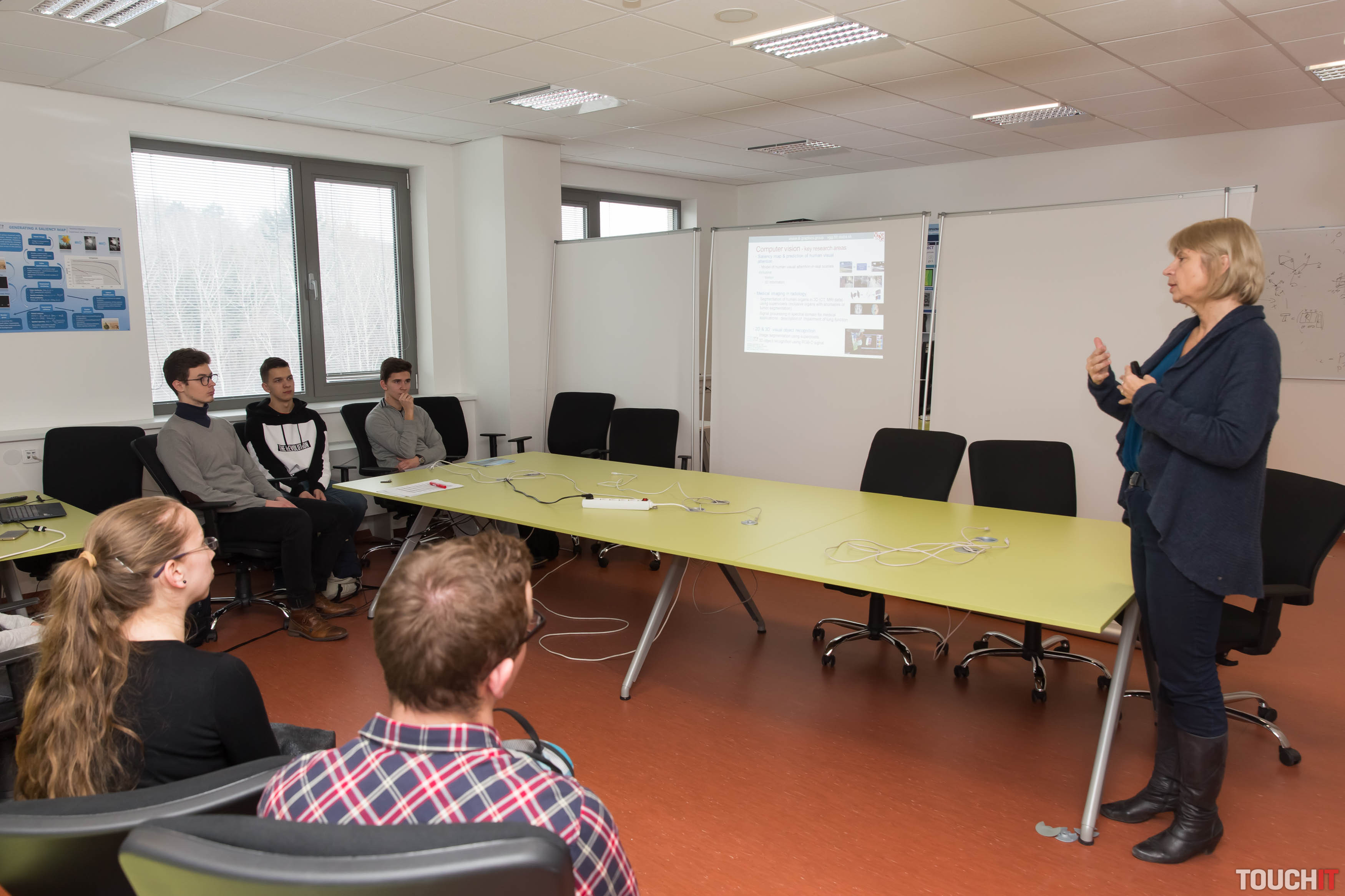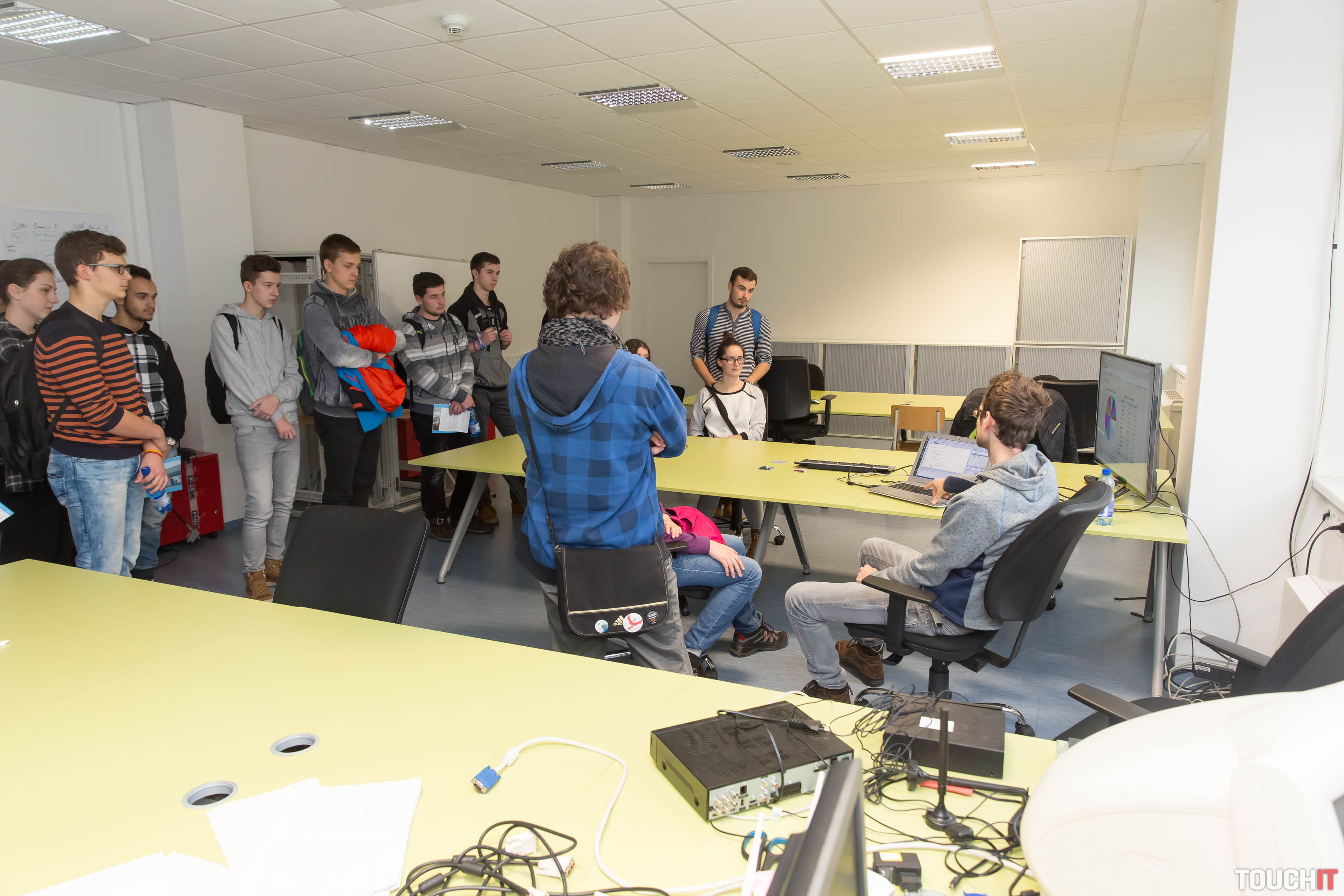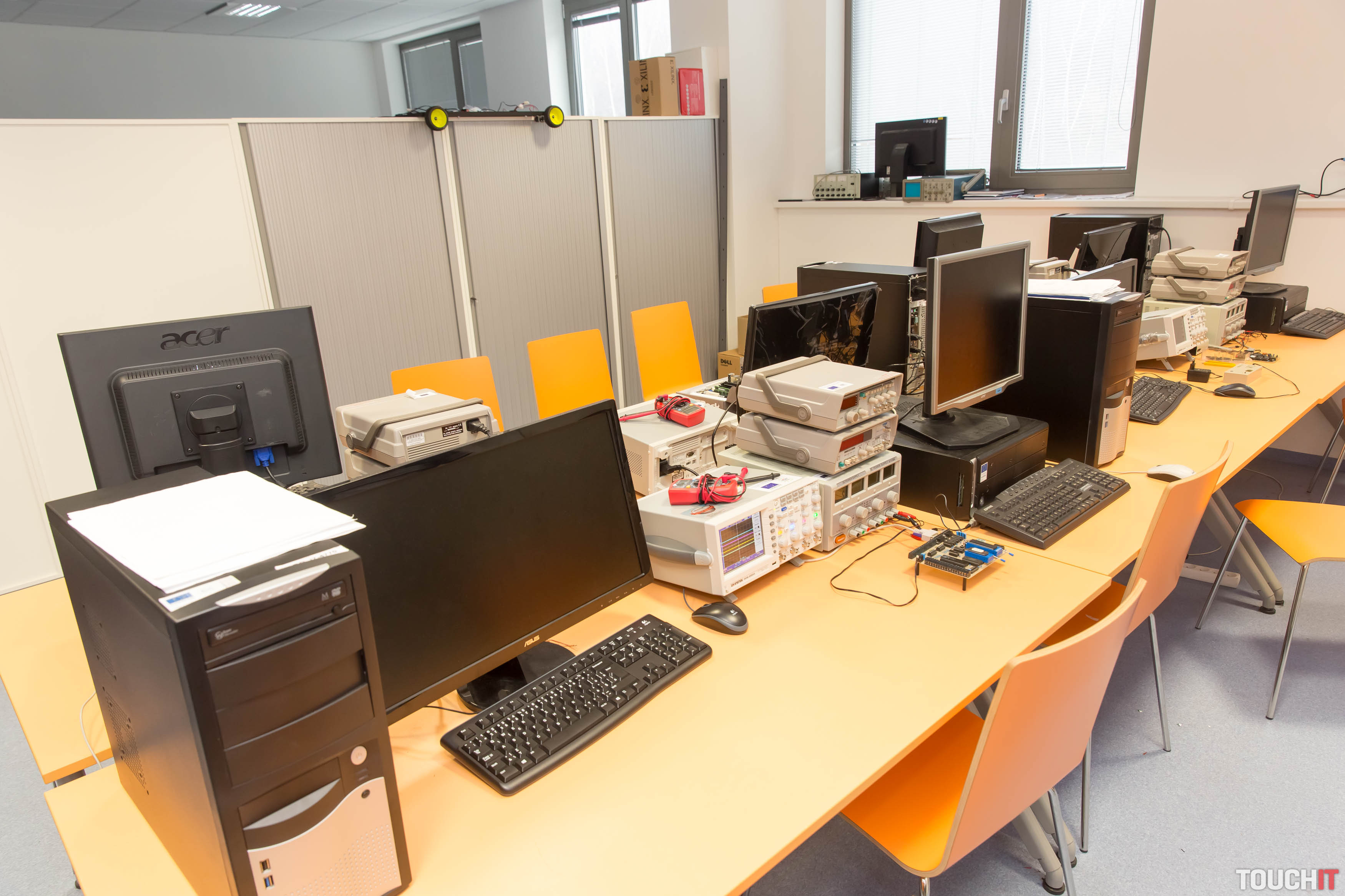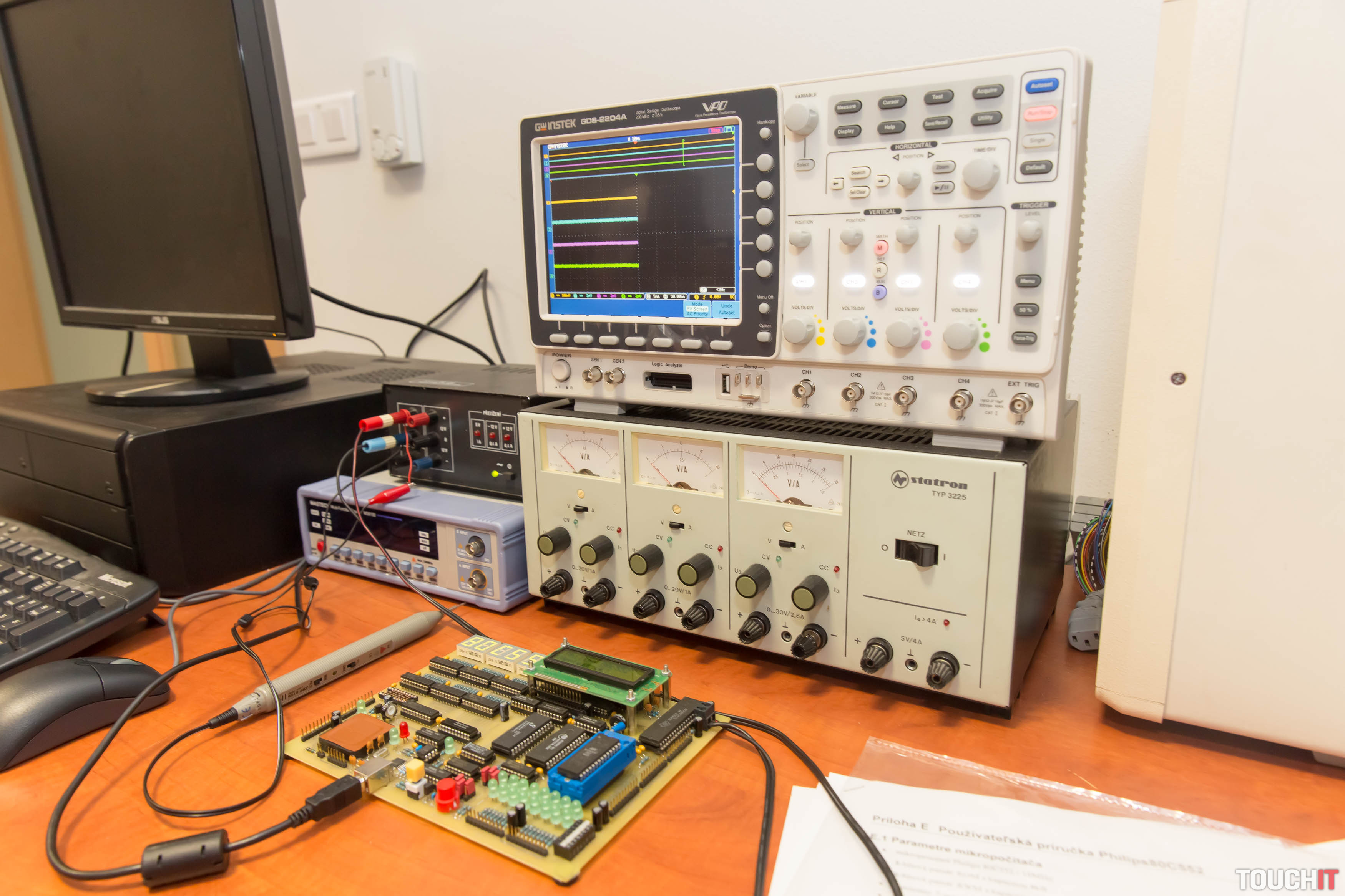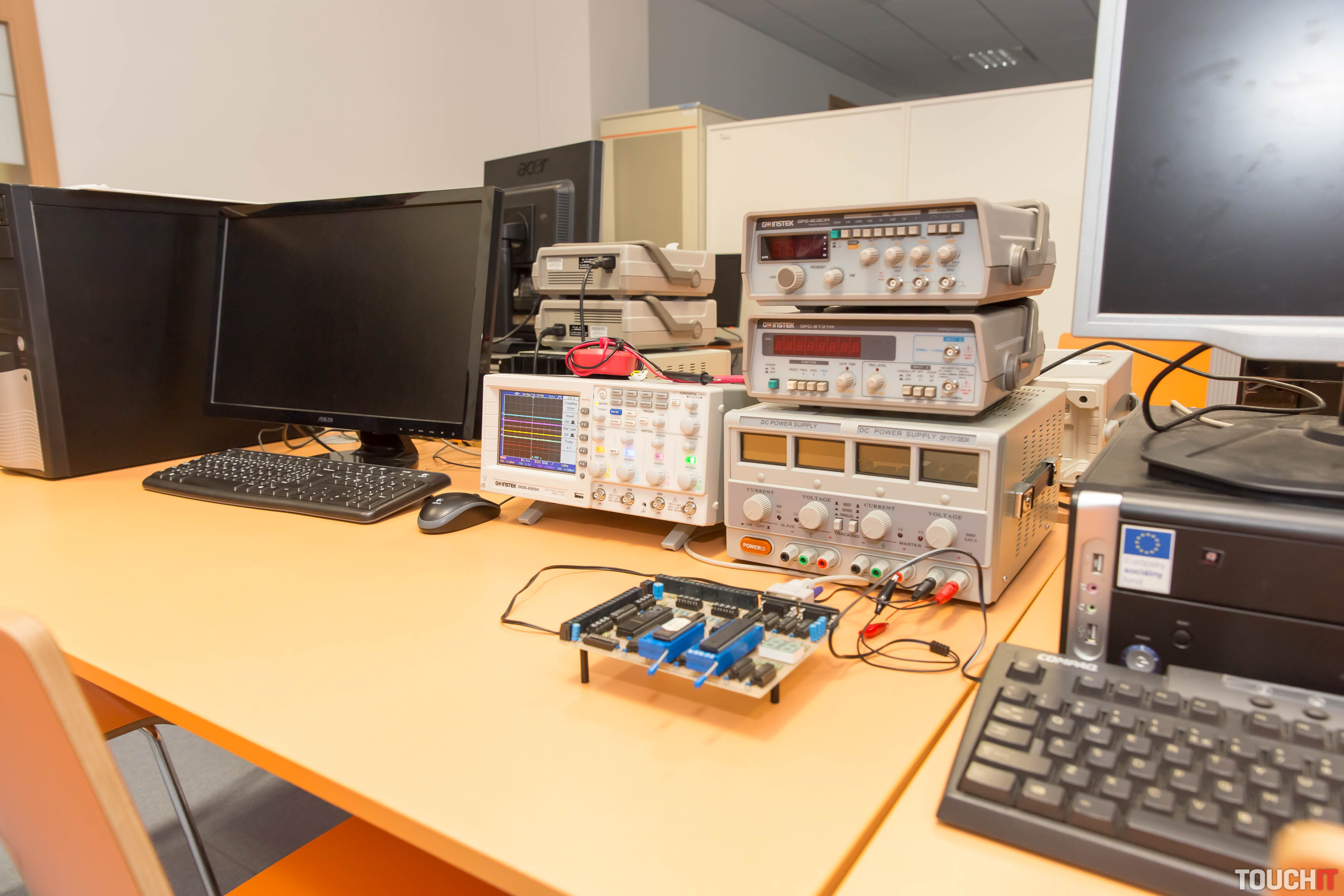 Budúci poslucháči si pozreli aj meracie zariadenia na analýzu vyvíjaných zariadení. Pracovisko malo názov ESLAB: laboratórium vnorených systémov. Videli sme tu mikropočítače vyvinuté v rámci projektov, logické analyzátory, emulátory, programátory, MP vývojové kity, XILINX vývojové kity.