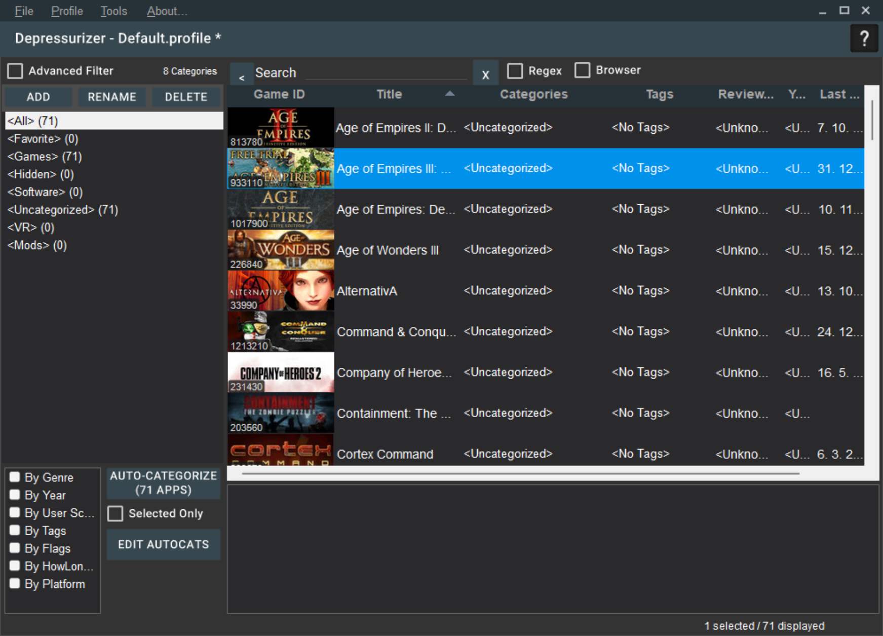 Nejde o kritickú chybu, no v nástroji sa aj podľa informácií nemusia objaviť vaše položky. Steam ponúka inovované rozhranie, ktoré je tu s nami niekoľko mesiacov. Autori vykonali dobrú prácu, no pri veľkej zbierke oceníte doplnkový nástroj na správu. Depressurizer má uľahčiť správu veľkých knižníc a automaticky vytvárať kategórie hier. Bude to robiť na základe údajov zo stránky Steam. Ide napríklad o kategóriu hier pre jedného hráča, podľa vydavateľov či roku vydania alebo hodnotenia.