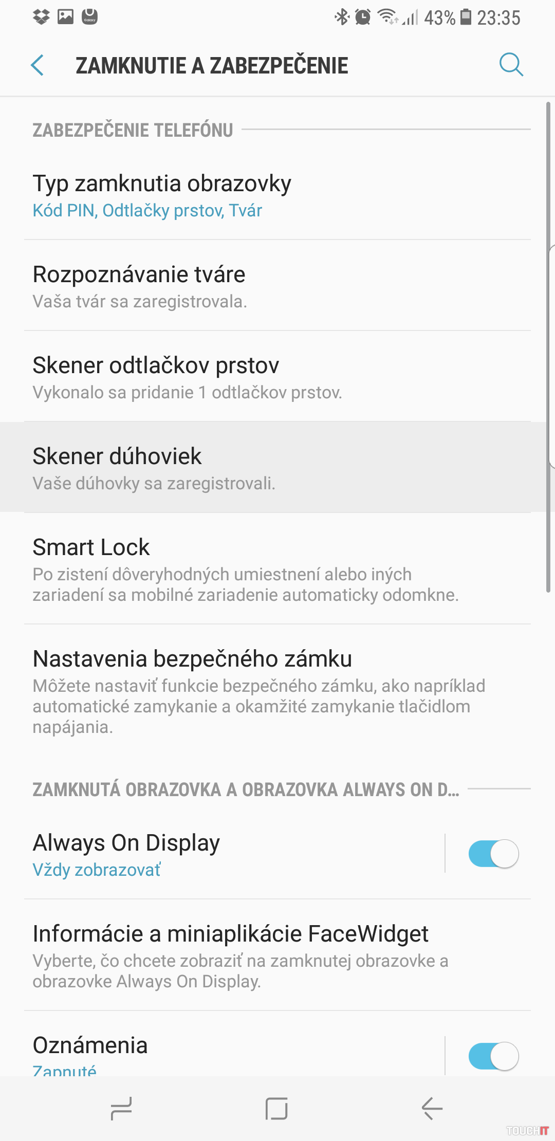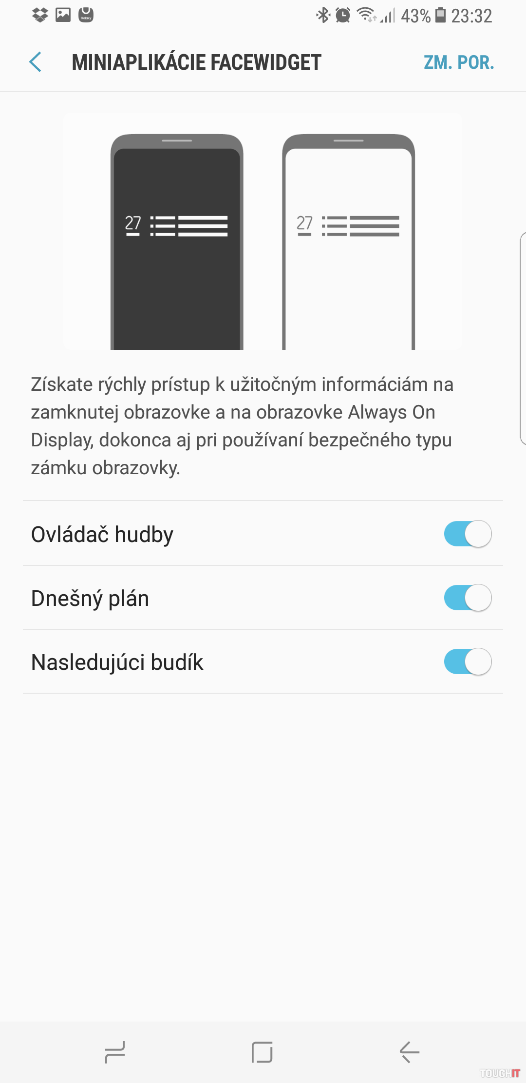 Vylepšila sa funkcia Allways On Display – na vypnutom displeji stále vidíte čas, ale teraz môžete aj riadiť prehrávanie hudby alebo sa pozrieť na to, ako je nastavený budík a iné funkcie. Allways On Displej spotrebováva len málo elektrickej energie navyše. Čo sa bude zobrazovať nájdete v nastaveniach.