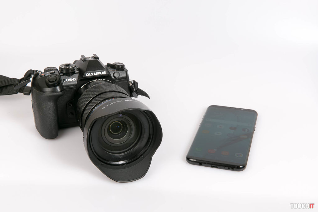 Porovnanie veľkosti fotoaparátu Olympus OMD E-M1II a telefónu Samsung Galaxy S8+