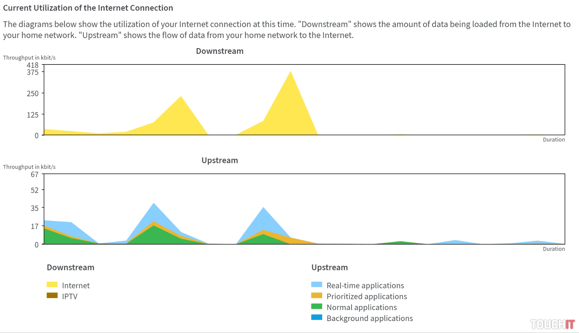 Základom je tzv. Online Monitor. Rozdiel oproti bežným routerom, ktoré zobrazia maximálne aktuálne vyťaženie v číslach, je detailnosť. Tu je vidieť download a upload samostatne na grafe s časovou históriou. Vidíte internetovú linku a ak máte aj IPTV, tak tento údaj bude znázornený svojou farbou. K tomu je tu navyše delenie prenosov na tie, ktoré vyžadujú tzv. real-time, teda napríklad videokonferencie, streamovanie TV z internetu a ďalšie. Medzi tieto údaje sú pridané priorizované aplikácie, normálne a aktivity na pozadí.