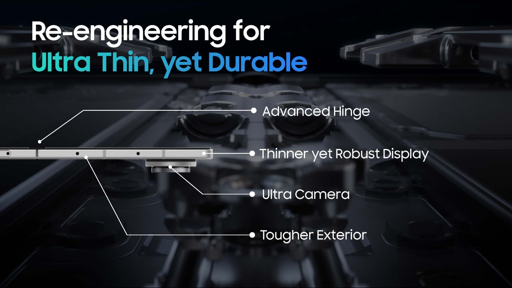 Hlavná pozornosť bola venovaná skladačke Galaxy Z Fold7. Tá má v rozloženom stave hrúbku len 4,2 mm, v najtenšej časti v zloženom stave je to 8,9 mm. Hmotnosť tohto skladacieho zariadenia je 215 g. Voči prvej skladačke od firmy Samsung, teda Galaxy Z Fold2 je to výrazné zníženie hrúbky celého zariadenia.