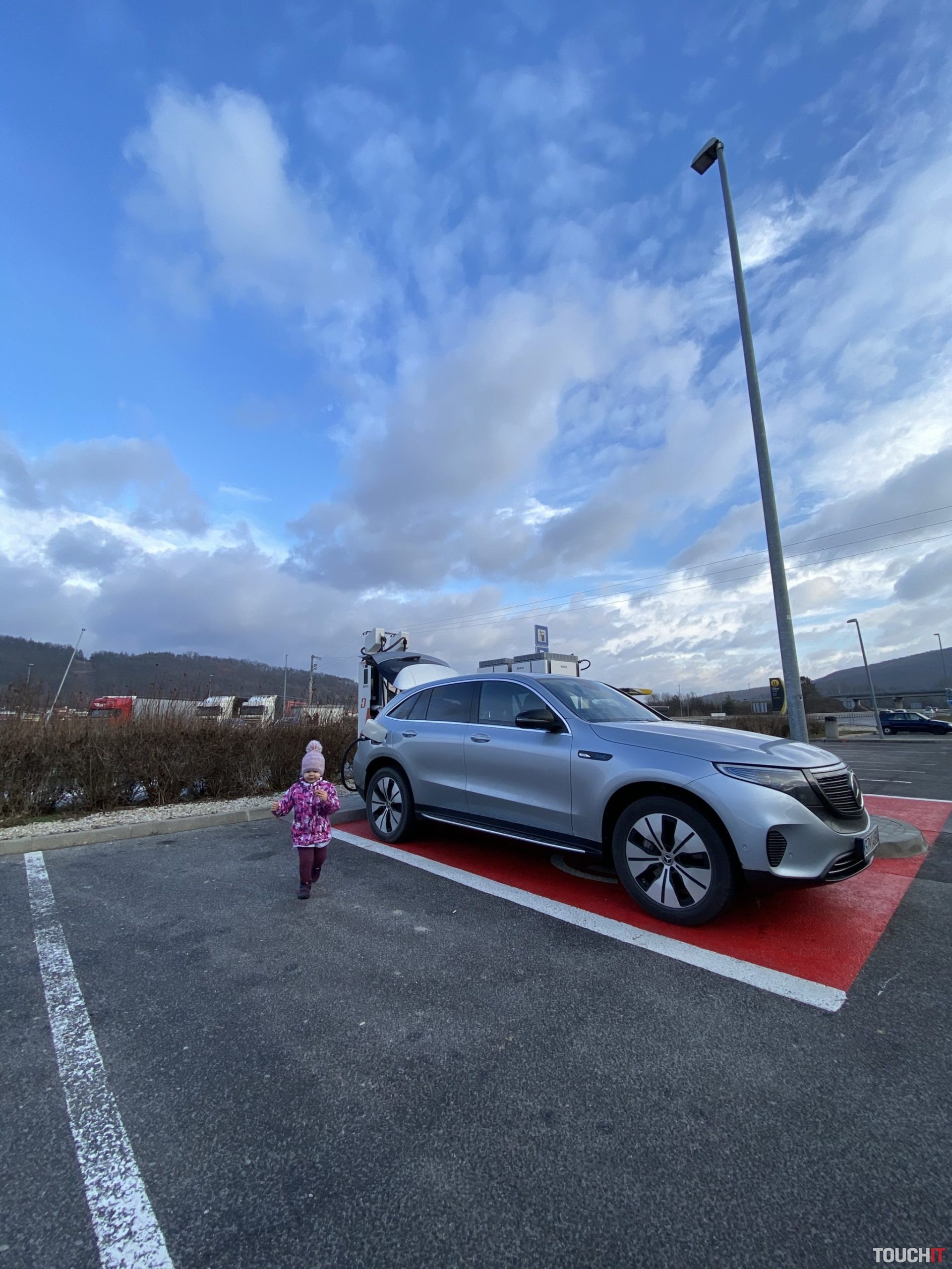 Mercedes EQCAko nabíjanie v testovacej prevádzke funguje? Nabíjanie nespustíte sami, to je podstatná informácia. Treba odparkovať, pripojiť nabíjací kábel, ísť za obsluhou čerpacej stanice a povedať, že chcete nabíjať elektromobil. Následne s vami poverený človek pôjde ku nabíjačke a NFC čipom ju spustí. To isté platí aj na konci nabíjania, resp. ak nabijete na 100%, tak sa konektor uvoľní sám, inak je potrebné nabíjanie deaktivovať čipom, čo bude väčšina prípadov. Takto sme to spravili aj mi. Asi hodinu sme strávili nabíjaním, pričom sme sa najedli („človek s lepeňákom v ruke a 100 tisícovým mercedesom je pekná podívaná“) a vo vnútri sme si dali dobrú kávu a deti horúcu čokoládu. Je dobré vedieť, že prevažná väčšina takýchto čerpacích staníc má slušné priestory, kde viete posedieť a stráviť určitý čas počas nabíjania.
