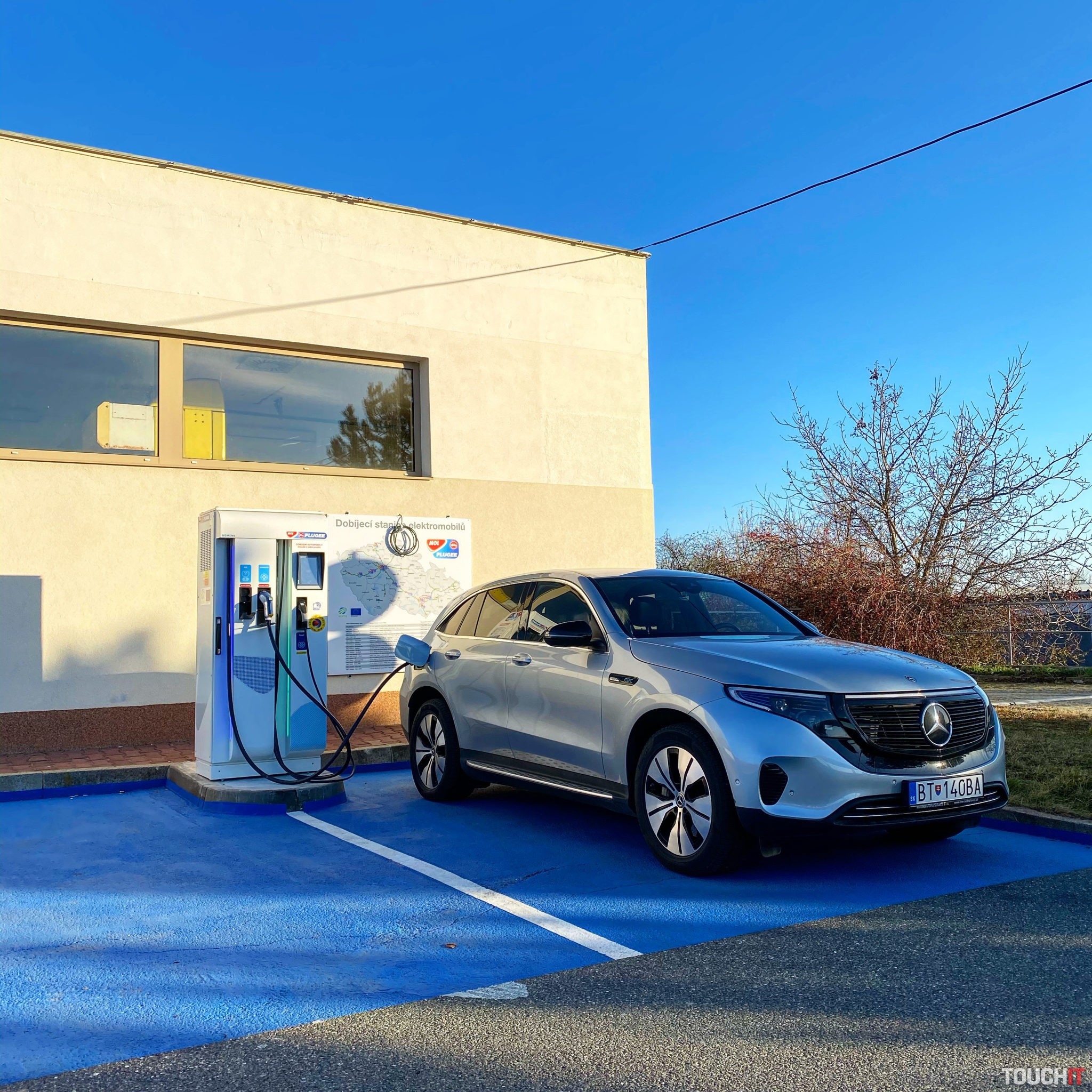 V čase nášho príchodu stálo pri 50 kW nabíjačke maďarské BMW i3, ktoré sa nabíjalo, takže CCS konektor bol obsadený a pomalším Mennekesom sa mi nabíjať nechcelo. Energie mal Mercedes EQC ešte dosť, a tak som sa na test presunul do Brna, presnejšie na čerpaciu stanicu MOL s adresou – Hviezdoslavova 1168/49 (hlavný ťah na Ostravu). Útulná čerpacia stanica, ktorá má pri umývacej linke 50 kW nabíjaciu stanicu – úplne prázdnu, ide sa nabíjať! Ešte dodám, že nabíjačky sú od spoločnosti Siemens, takže nejde o žiadnu lacnú haraburdu. Známe ovládanie a dobrá funkčnosť, to sa cení.