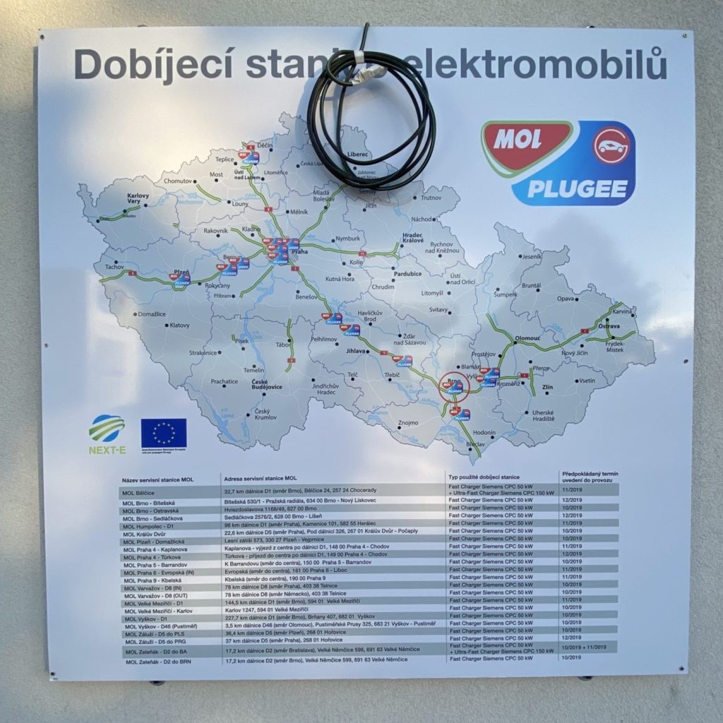 Google mapy – trasaDruhá vec, ktorá ma veľmi zaujímala, boli nabíjacie stanice od poskytovateľa MOL, ktoré majú byť v skúšobnej prevádzke úplne zadarmo. Aktuálne je týchto nabíjacích staníc v Čechách viac ako desiatka, pričom stále pribúdajú nové. Zväčša sa nachádzajú na frekventovanejších ťahoch a vo väčších mestách. Hneď po prechode do Čiech (43 kilometrov od čiary) máte na oboch stranách diaľnice D2 čerpaciu stanicu MOL (Zeleňák), kde sa nachádzajú 2 kusy nabíjacích staníc pre elektromobily. V smere z Bratislavy do Brna je k dispozícii bežná 50 kW nabíjačka a na opačnej strane, teda v smere z Brna do Bratislavy je k dispozícii 150 kW rýchlo nabíjačka.