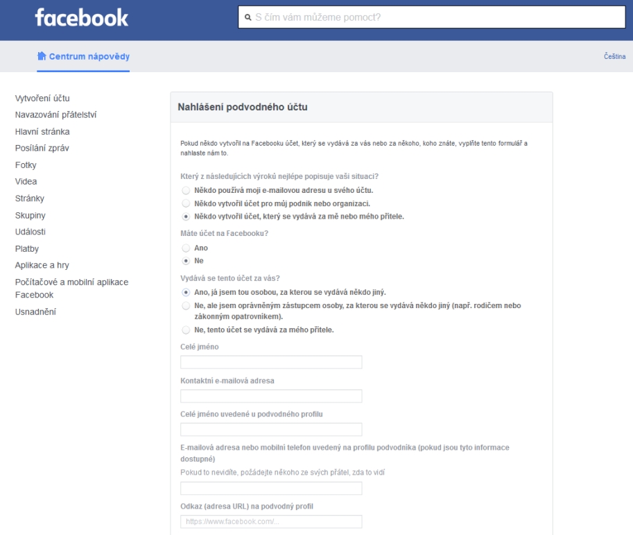 V prípade Facebooku použite reportovaciu stránku https://sk-sk.facebook.com/help/contact/169486816475808, kde môžete vybrať druh porušenia podmienok. Tým hlavným je tretia možnosť v podobe – Niekto vytvoril účet s osobnými údajmi mňa alebo môjho priateľa. Ak by ste pri procese mali problém s niektorými pasážami v anglickom jazyku, môžete si stránku prepnúť do českého rozhrania (kliknutím na dolnom paneli, alebo prepísaním odkazu v časti sk-sk na cs-cz), kde je formulár preložený kompletne.