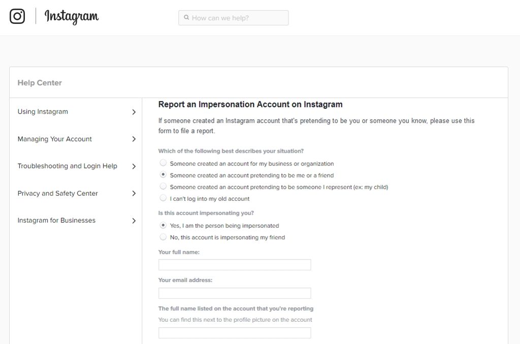 Kliknite v ňom na možnosť „Someone created an account pretending to be me or a friend“ (niekto vytvoril profil predstierajúci, že som ja, alebo môj priateľ) a následne na „Yes, I am the person being impersonated“ (áno, ja som osobou ktorá je imitovaná). Bude potrebné vyplniť vaše meno a priezvisko a doložiť doklad totožnosti. Keďže vlastníkom Instagramu je Facebook, formulár je celkom totožný s tým Facebookovým. Ak by ste niektorým anglickým častiam nerozumeli, môžete si pomôcť otvorením takmer totožného formulára na Facebooku. Ten je preložený.