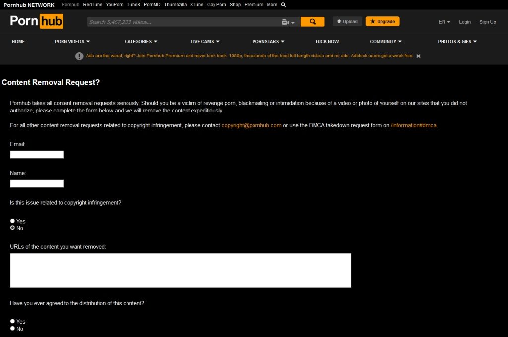Na najväčšej pornostránke na svete v podobe Pornhub.com môžete video nahlásiť pomocou formulára https://www.pornhub.com/content-removal. Zadajte v ňom svoje meno, email a označte, že nejde o nahlásenie porušenia autorských práv (takéto nahlásenie totiž slúži pre profesionálnych tvorcov porno videí, ktoré niekto nepovolene uploadoval).