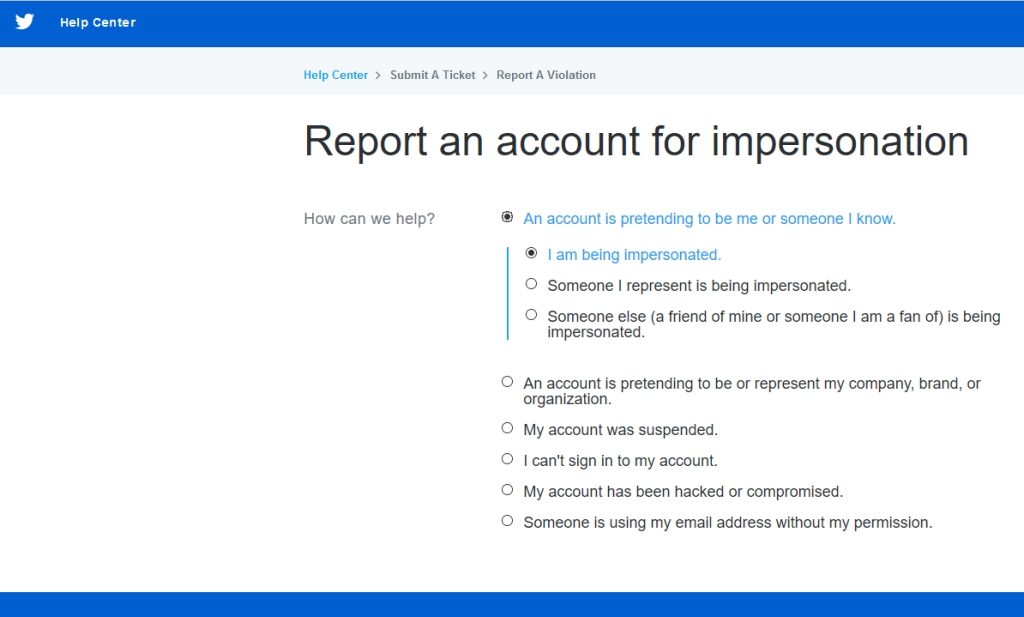 Na Twitteri imitátorský účet nahlásite na adrese https://help.twitter.com/forms/impersonation. Vyberte prvú možnosť „An account is pretending to be me or someone I know“ (účet predstiera, že som to ja, alebo niekto koho poznám) a následne „I am being impersonated“ (niekto sa vydáva za mňa). Opäť sa stretnete so zadaním svojho mena a nahratím fotky dokladu totožnosti.