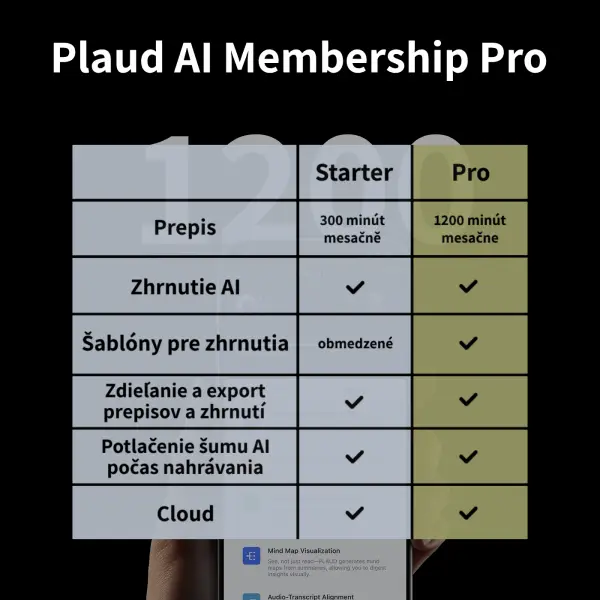 Prepojenie hlasového záznamníka s ChatGPT má množstvo výhod. Pomocou aplikácie Plaud je totiž možné nadiktované nahrávky prepisovať, vytvárať z nich súhrny či dokonca myšlienkové mapy. Súčasťou záznamníka je aj predplatné Plaud AI Membership, ktoré je k dispozícii zadarmo alebo za poplatok. V prípade predplatného zadarmo s názvom Starter máte k dispozícii 300 minút prepisu mesačne. Ak by ste však chceli využívať Plaud Note vo väčšej miere, môžete si predplatiť program Pro s možnosťou prepisu až 1200 minút mesačne. Aktuálna cena tohto predplatného je 249 korún českých (cca 10 eur) za mesiac, prípadne 1990 korún českých (cca 80 eur) ročne.