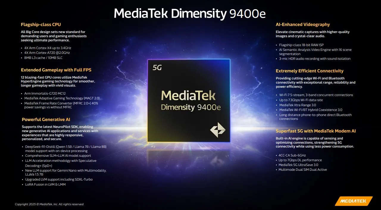 Dimensity 9400e je navrhnutý tak, aby zvládal aj tie najnáročnejšie úlohy, ako hranie hier, prácu s umelou inteligenciou alebo rýchle pripojenie na internet. Má osem jadier „All Big Core“ v zložení 1× Cortex-X4 (3,4 GHz), 3× Cortex-X4 (2,85 GHz) a 4× Cortex-A720 (2,0 GHz). O grafiku sa stará 12-jadrový grafický čip Immortalis-G720 MC12, ktorý podporuje aj moderné technológie ako ray tracing, čo ocenia najmä hráči.