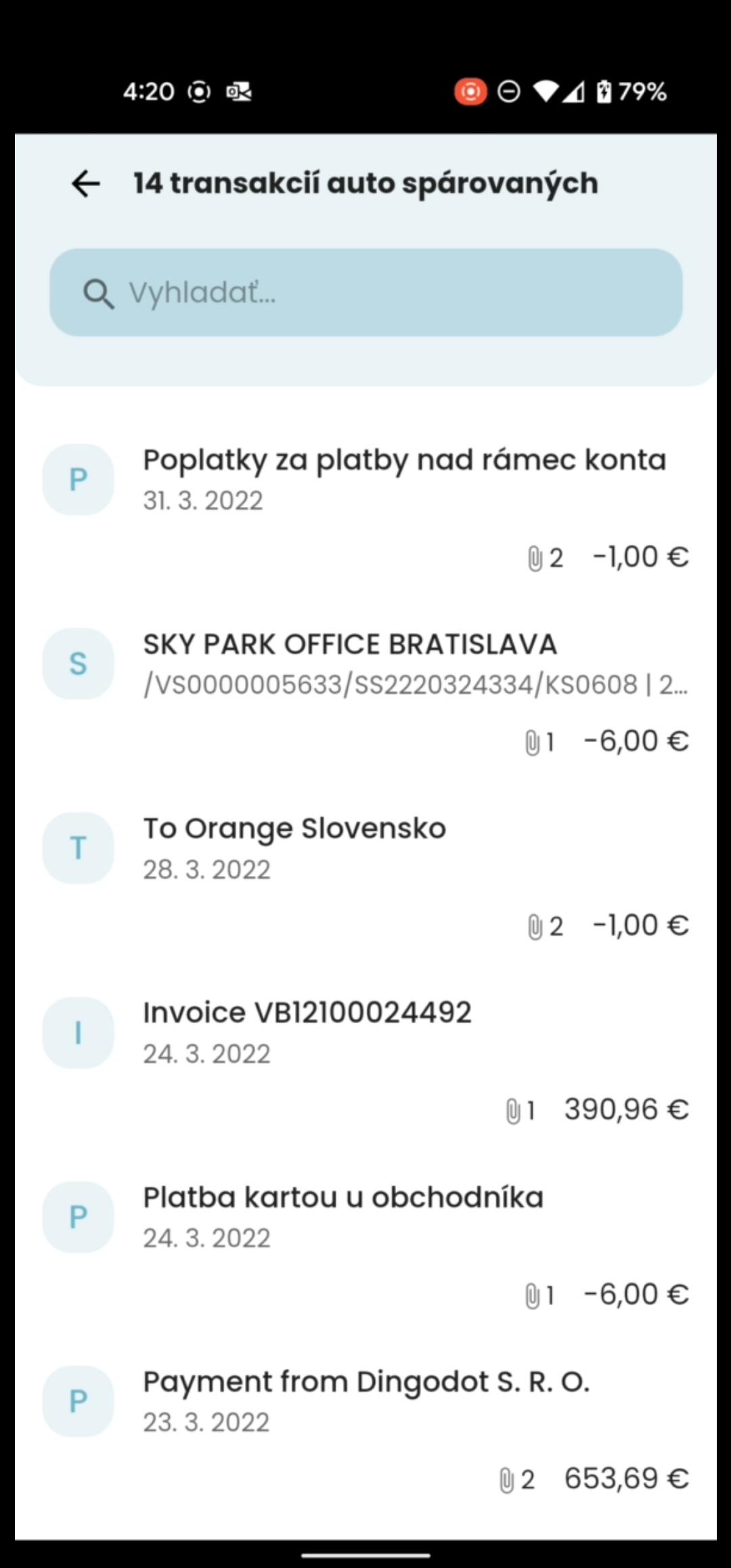 Popísaná príprava podkladov pre účtovníka je len jedna úloha DingoDot. Okrem toho dokáže fungovať ako digitálny archív platieb aj faktúr s fulltextovým vyhľadávaním a to nad celou históriou. Vyhľadať sa dá napr. aj podľa výšky platby, variabilného symbolu, mena partnera, názvu tovaru a pod. Platby sú pritom vzájomne prepojené aj s príslušnou faktúrou. To oceníte napr. aj vtedy, keď chcete tovar reklamovať a potrebujete k tomu faktúru.