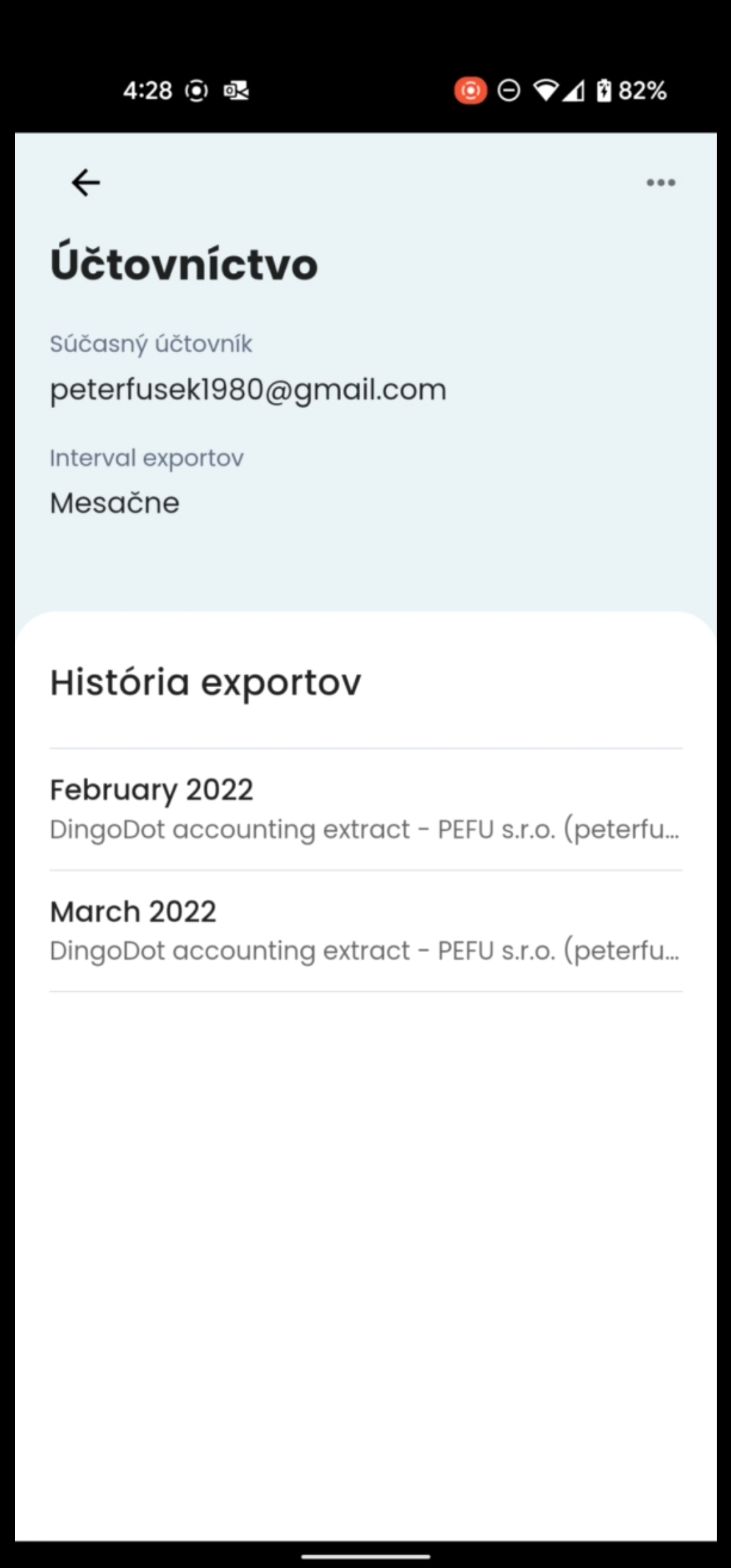 V nastavení aplikácie zadávate mailovú adresu účtovníka a tiež periodicitu zasielania výpisov. Dobre to funguje pri príprave podkladov pre odpočet DPH tak, aby ste nemali problém, že niečo nestihnete zaúčtovať do stanoveného termínu.