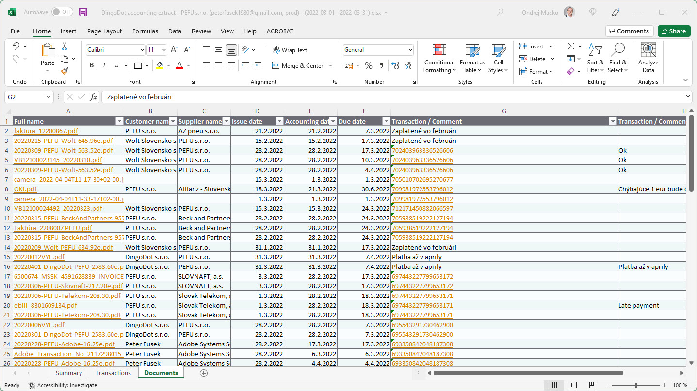 Vytvorený excelovský súbor obsahuje základné informácie o faktúrach plus nalinkované súvisiace dokumenty o platbách. Tieto dokumenty sú uložené v cloude a sú teda stále k dispozícii. Okrem toho sa účtovníkovi zobrazujú aj vyššie spomenuté poznámky, ktoré ste si k dokumentu vytvorili na ošetrenie špeciálnych prípadov nespárovaných faktúr.