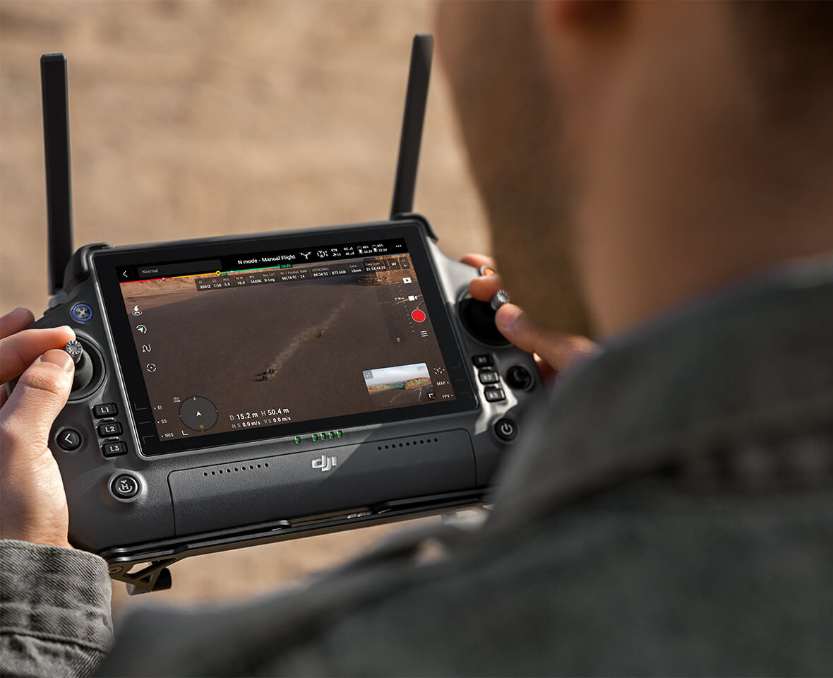 Nový dron DJI sa dodáva aj s diaľkovým ovládačom profesionálnej triedy DJI RC Plus, ktorý má 7-palcový displej s jasom 1200 nitov na lepšie používanie v podmienkach s ostrým okolitým svetlom. Maximálny dosah na prenos videa je 15 kilometrov, čo je takmer dvakrát viac než u DJI Inspire 2.