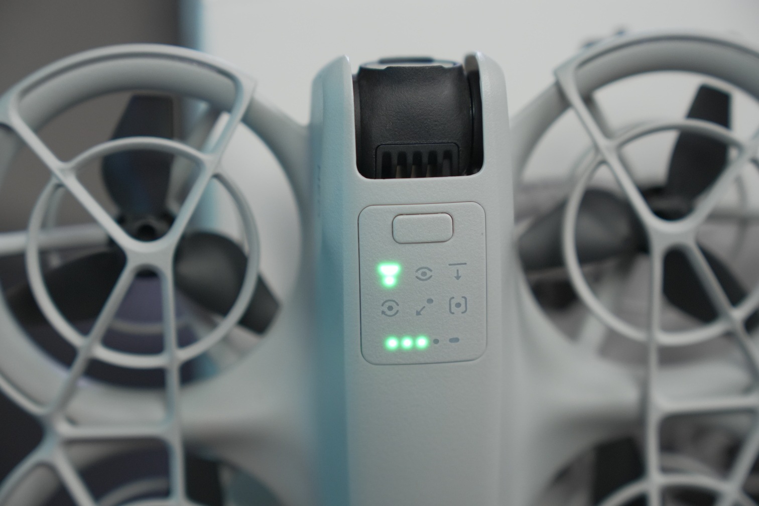 DJI Neo neobsahuje žiadnu pamäťovú kartu, nahráva sa len do vnútornej pamäte, ktorej kapacita je 22 GB. Je to dosť miesta na celodenné rodinné nahrávanie videí a fotení pri najvyššom rozlíšení (40 minút pri 4K obraze). Prenos obrazu je možný len pomocou USB-C portu v zadnej časti dronu. Takto sa aj nabíja Li-Ion batéria s kapacitou 1435 mAh.