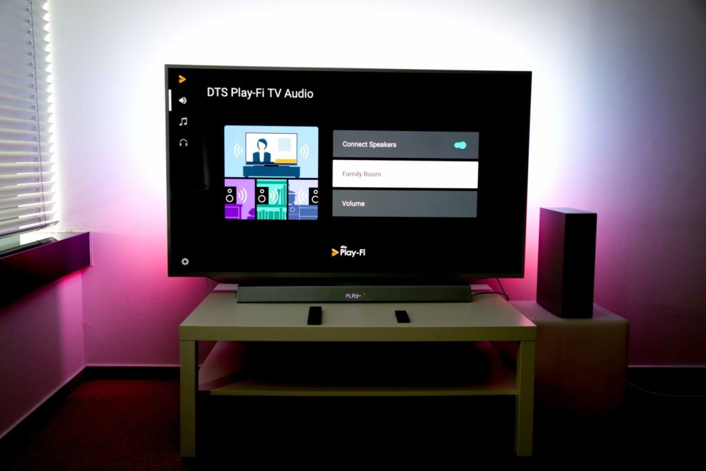 My sme mali celý systém zapojený tak, že soundbar sme mali prepojený s televízorom cez HDMI ARC a na soundbar sme sa bezdrôtovo pripájali s mobilným telefónom cez Play-Fi. Soundbar je pritom napojený na domácu Wi-Fi sieť, cez ňu sa aj aktualizuje.