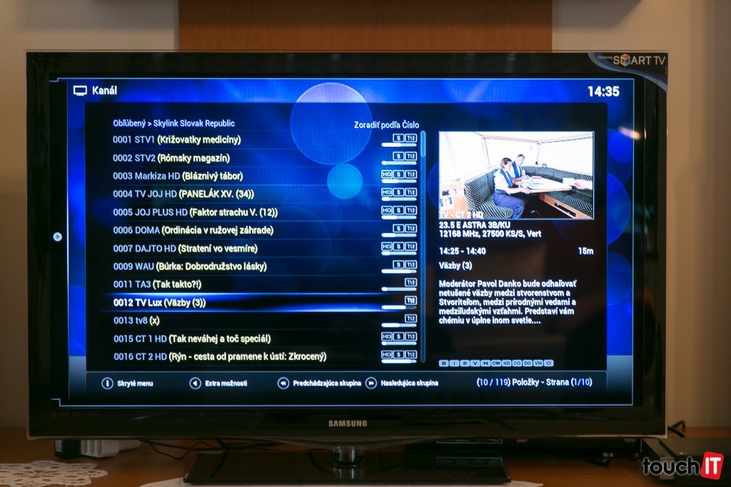 Zoznam kanálov môže obsahovať až 10 000 položiek. Výborné je, že v zozname kanálov máte aj informáciu o práve vysielanom programe a tiež grafickú informáciu, v ktorej časti sa vysielaný program práve nachádza. To výrazne uľahčuje výber kanálov. EPG je možné prehľadne zobraziť aj v mriežke, priamo z nej je potom asi najjednoduchšie vyberať program, ktorý si chcete nahrať.
