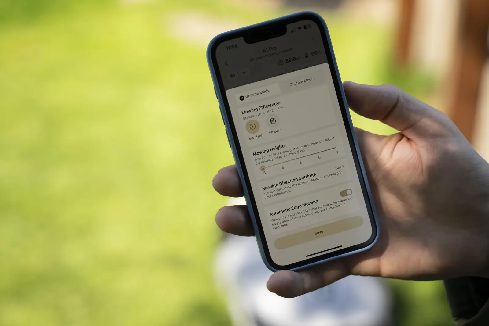 Výšku kosenia si môžete nastaviť od 3 do 7 cm. Takisto si môžete prispôsobiť aj smer kosenia, alebo zadefinovať, aby kosačka po každom kosení tento smer menila. K dispozícii je tiež nastavenie pre automatické kosenie po obvode po skončení kosenia celej plochy a prispôsobenie citlivosti vyhýbania sa prekážkam po obvode.