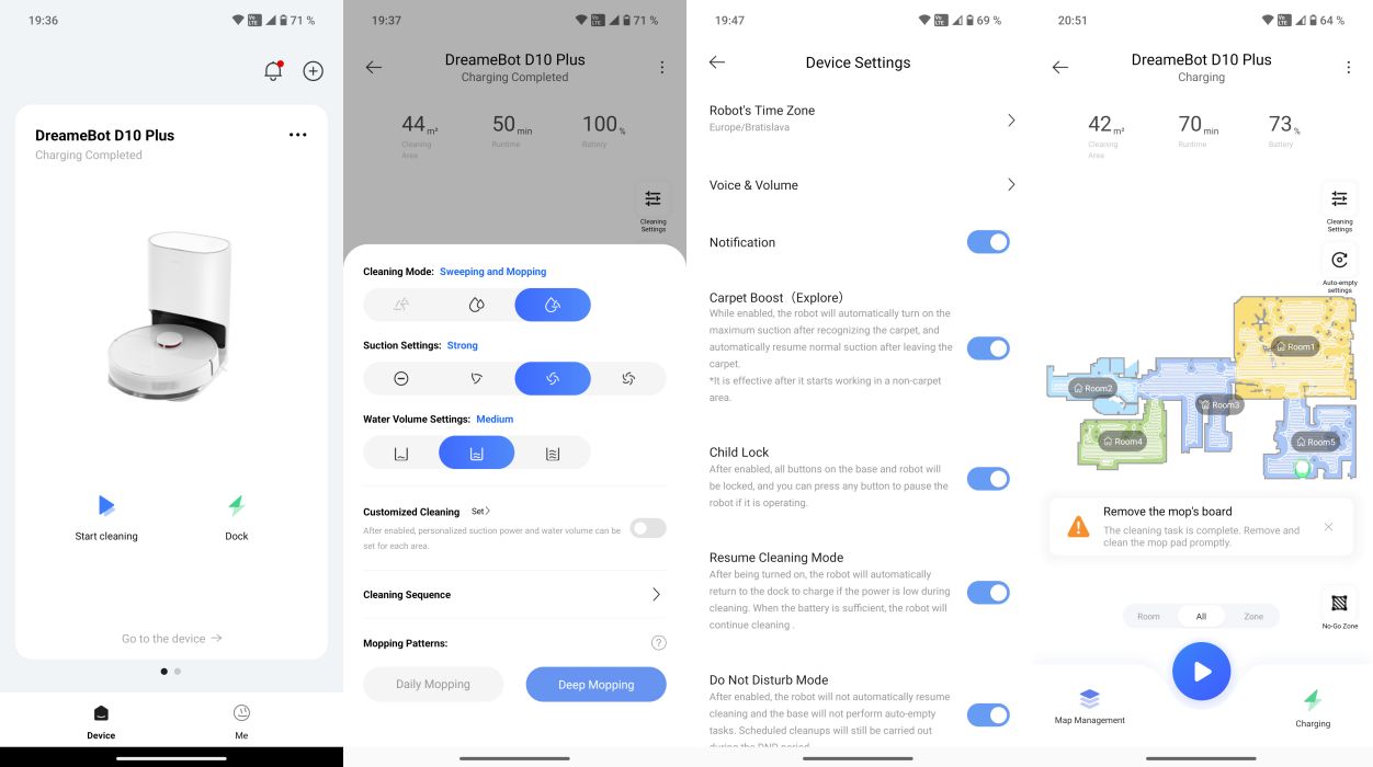 DreameBot D10 Plus ponúka režim vysávania, mopovania alebo vysávania a mopovania súčasne. Všetky nastavenia a režimy si môžete upraviť v aplikácii Dreamehome pre Android a iOS. Aplikácia neponúka lokalizáciu do slovenčiny či češtiny, je dostupná v angličtine. K dispozícii je podpora pre hlasových asistentov Alexa a Google Asistent.