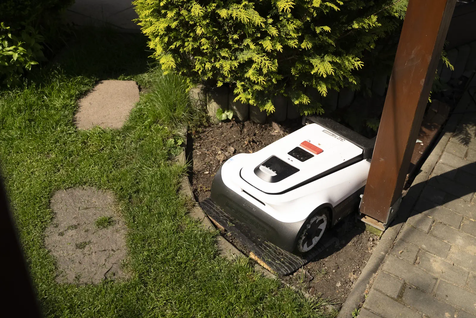 Ja som kosačku umiestnil na testovacej záhrade do rohu ku kríku, pričom som si vytvoril pomocné drevené dosky, aby som zabezpečil, že povrch pod dokovacou stanicou bude pevný a rovný. Celá inštalácia, ak si odmyslím prípravu dosiek, trvala cca 10 minút. Väčšinu času zabralo uchytenie RTK stanice.