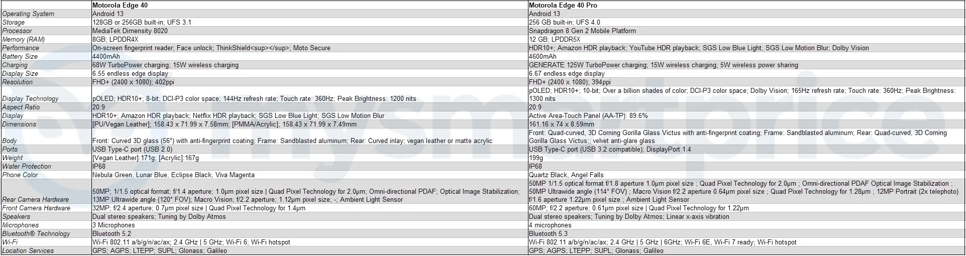 Doteraz síce neboli zverejnené kompletné technické parametre týchto telefónov, avšak teraz sa to mení. Okrem ich detailného popisu uniknutá tabuľka prezrádza aj hlavné rozdiely medzi verziami Edge 40 a Edge 40 Pro. Zdroj prízvukuje, že zoznam parametrov je skutočný, pričom sa odvoláva na osobu, ktorá oficiálne technické parametre pozná.