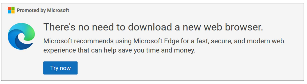 Jeden z príkladov temných vzorov: Vyhľadávač Bing zobrazuje túto správu, keď sa používateľ snaží nájsť konkurenčný prehliadač. Napríklad Vivaldi.