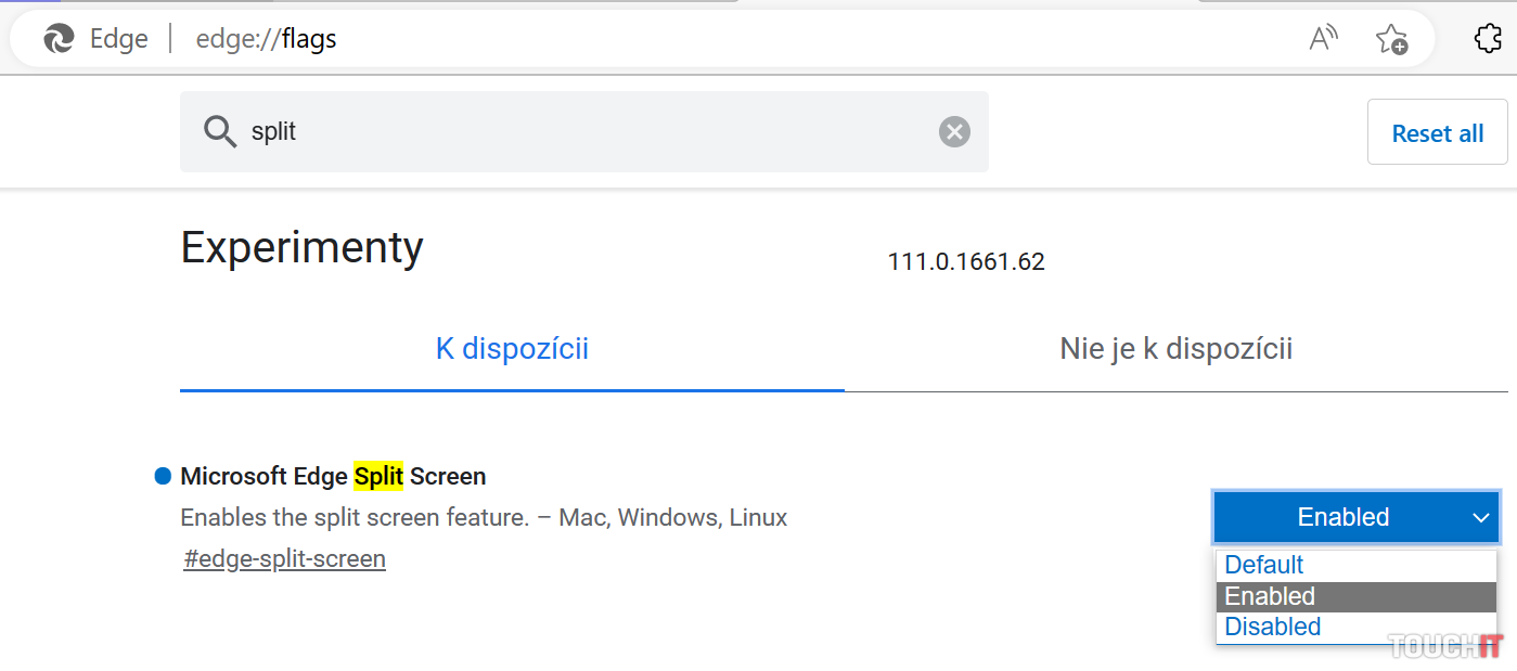 Vyhľadajte položku Microsoft Edge Split Screen a zmeňte jej nastavenie na Enabled.