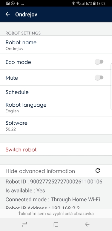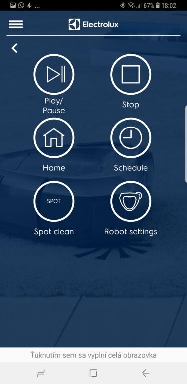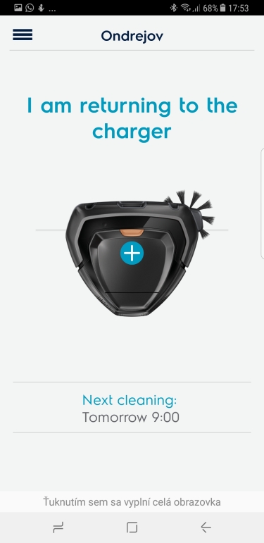 Tá je zatiaľ v anglickom jazyku, na konci roka pribudne jej česká jazyková verzia. Určená je pre iOS aj Android zariadenia. Na spárovanie mobilu a vysávača toho veľa netreba – ako prvý krok potrebujete načítať cez kameru v mobile čiarový kód z vysávača, čím sa vytvorí vlastná Wi-Fi medzi oboma zariadeniami. Následne si vyberiete domácu Wi-Fi sieť, ku ktorej bude pripojený vysávač a cez telefón zadáte heslo. Odvtedy už môžete vysávač ovládať – napr. spustiť alebo zastaviť vysávanie, naprogramovať ho, ale aj aktualizovať softvér vo vysávači. Úspešné spojenie signalizuje aj rozsvietený symbol Wi-Fi.