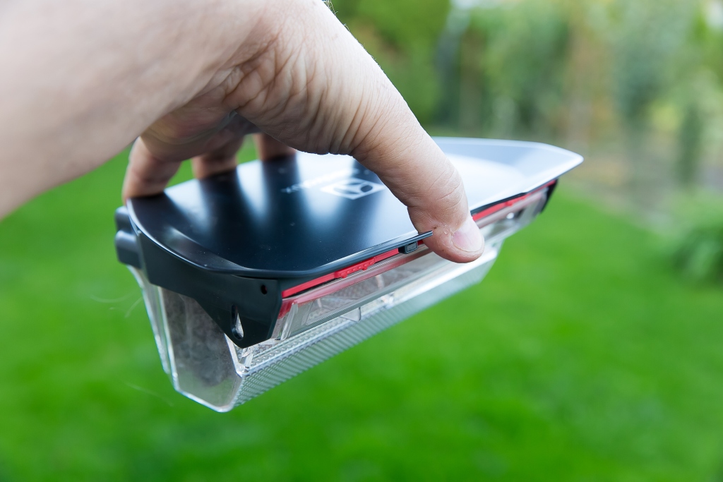 Vyprázdnenie zásobníka je jednoduché, stačí potlačiť tlačidlo v hornej časti a zásobník sa vysunie. Tento kontajner sa dá vysypať bez toho, aby ste sa museli rukou dotknúť špiny. V hornej časti zásobníka sa nachádza filter, ktorý je dobre vyprášiť a umyť vodou. Po 6 mesiacoch by sa mal meniť.
