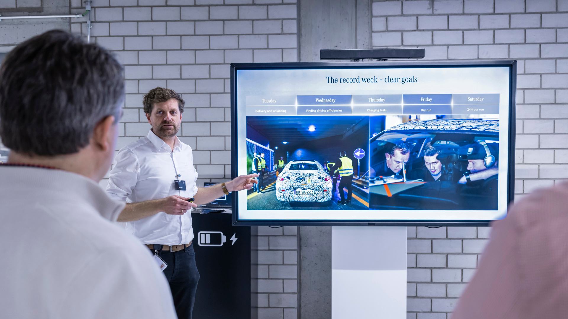 Počas tohto 24-hodinového testu sa batéria vozidla na štandardnej nabíjacej stanici nabila 40-krát. Prestávky v nabíjaní trvali len približne 10 minút. Ak ich zohľadníme, priemerná rýchlosť pri testovaní bola až 154,9 km/h. V rámci prípravy na jazdu sa určila ideálna stratégia nabíjania, aby sa dosiahla maximálna priemerná rýchlosť. Na skutočnej diaľkovej ceste sa táto optimalizácia uskutočňuje prostredníctvom navigácie s funkciou Electric Intelligence, ktorú popíšeme neskôr v tomto článku.