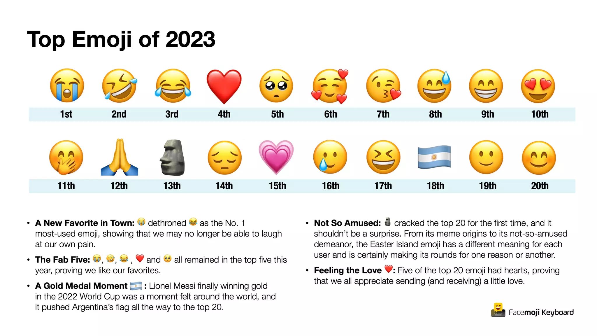 V prehľade, ktorý pripravila aplikácia Facemoji, sa dajú vidieť najpoužívanejšie Emoji vo svete za posledný rok. Prezentácia obsahuje najpoužívanejšie z nich počas obdobia od júna 2022 do júna 2023. Na vedúcej pozícii je plačúci Emoji, ktorý zosadil iný, podobný, avšak s podobnou tematikou. Poradie piatich najobľúbenejších sa počas roka nezmenilo. V prvej 20-tke sa objavila vlajka Argentíny, pravdepodobne aj z dôvodu víťazstva Lionela Messiho na svetovom pohári v minulom roku.