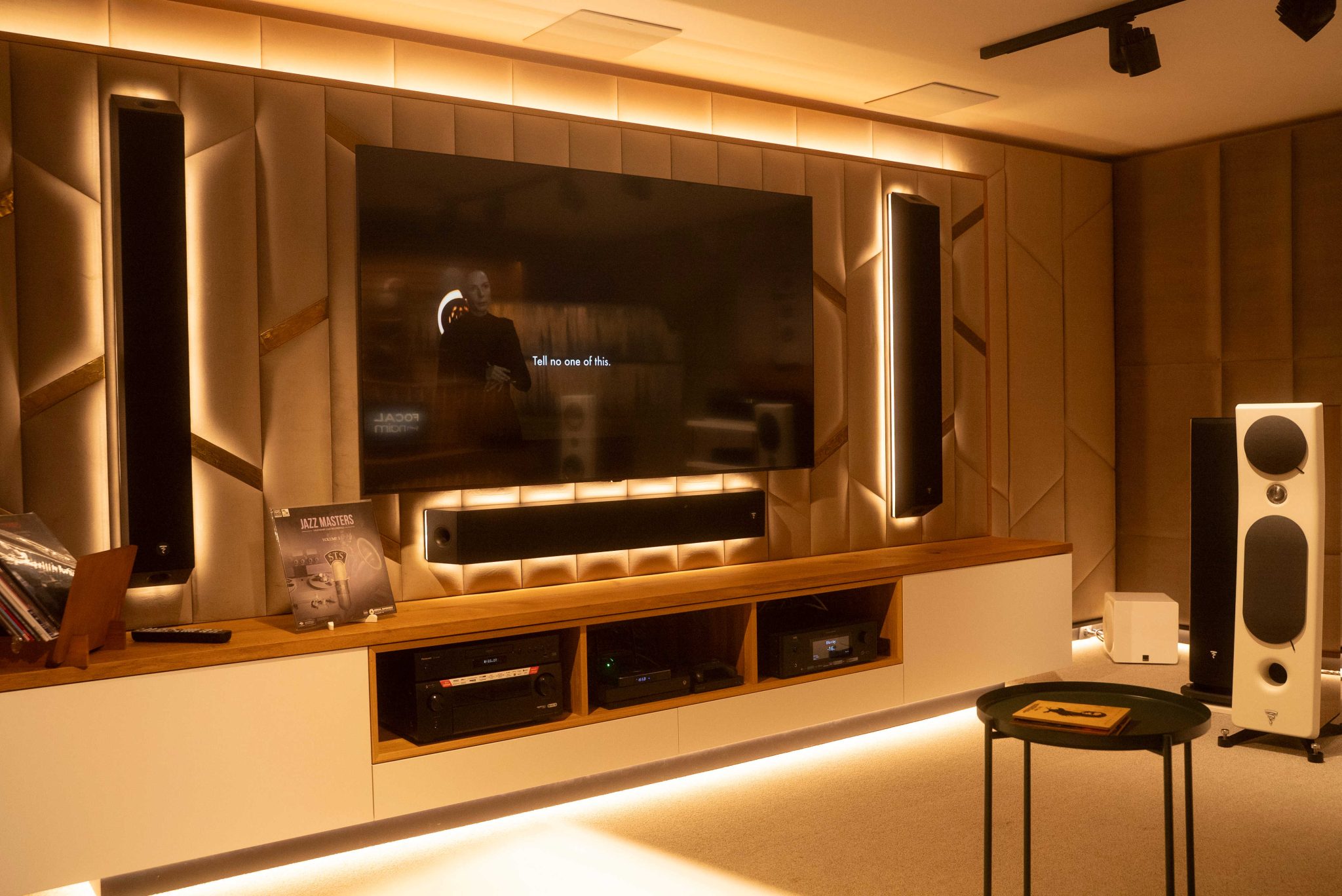Domáce kino v tomto showroome obsahuje OLED televízor značky LG, ktorý je vybavený audio zostavou Focal s troma reproduktormi. Nástenné reproduktory Focal On Wall 302 spolu s televízorom vytvárajú veľmi pútavú kino zostavu. Sú však používatelia, ktorí majú tieto veci radšej mimo dohľadu, a tak si môžete vybrať aj reproduktorovú zostavu zabudovanú do steny alebo do plafónu. Vtedy nie je vidieť žiadne káble a aj reproduktory prakticky splývajú so stenami.
