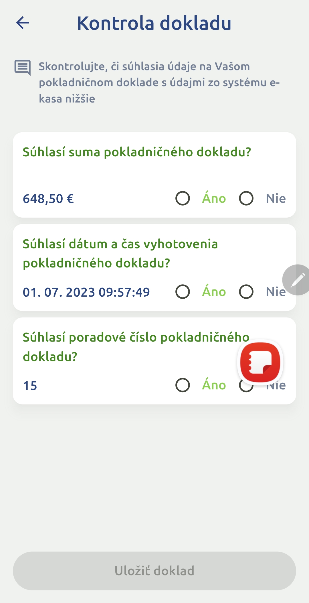 Aplikácia sa pri kontrola bločku používateľa pýta na tri otázky – či súhlasí suma, dátum predaja a poradové číslo dokladu. Ak sa zistí nezrovnalosť v týchto údajoch, Finančná správa ho bude riešiť. Vy sa do tohto procesu nebudete musieť zapojiť. Ste v úplnej anonymite aj pred obchodníkom.