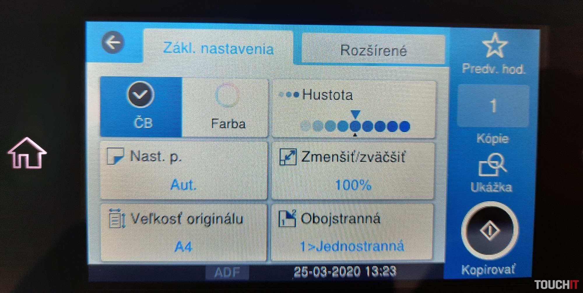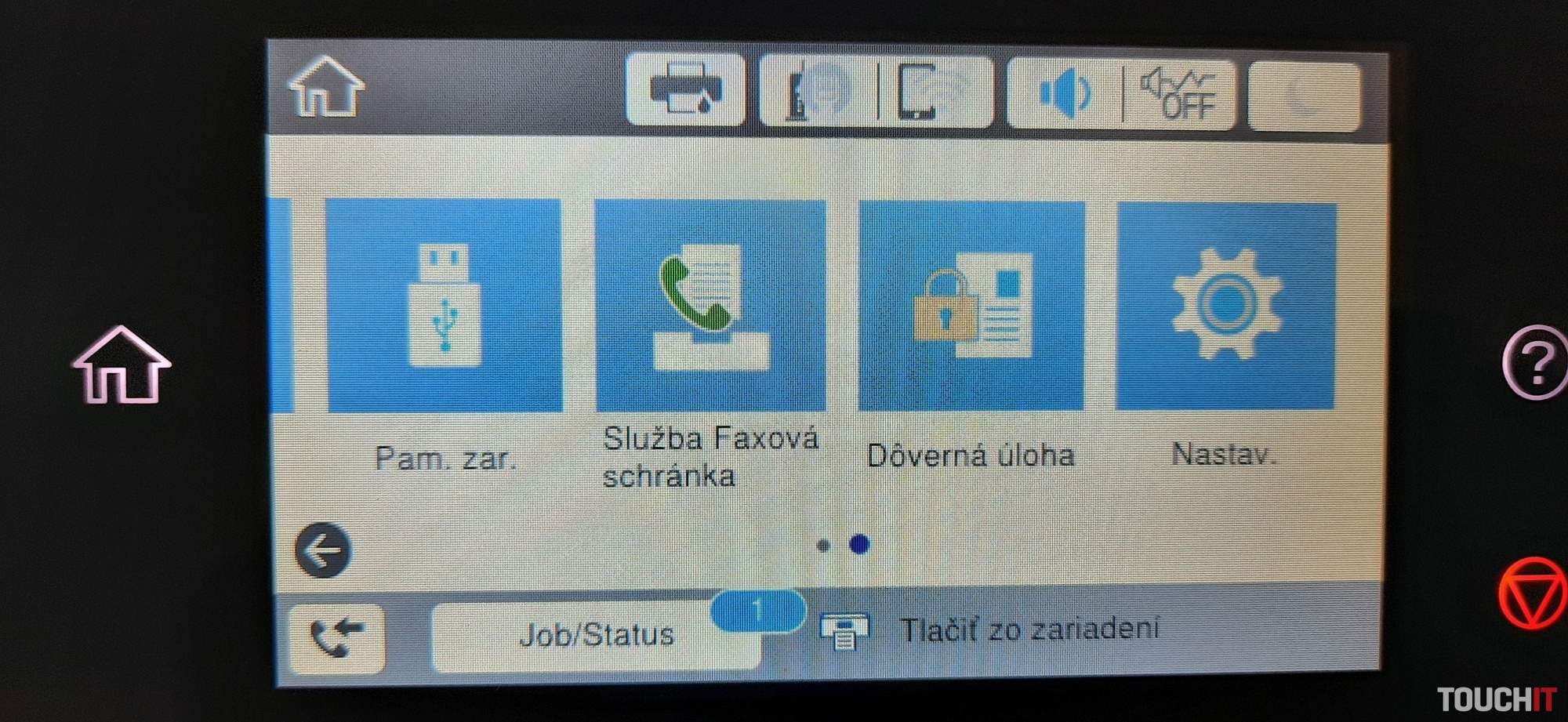 Dotykový displej podporuje gestá a vlastné nastavenia. My sme ocenili aj to, že si môžete nastaviť, aký režim má byť na hlavnom displeji predvolene zobrazený. Tlač môžete robiť aj z počítača alebo USB flash disku, ale ak často skenujete, oceníte zobrazenie možností hneď na prvej obrazovke. Druhý detail, ktorý sme ocenili, je možnosť uviesť zariadenie do tichého režimu. Dotyková voľba je v hornom stavovom riadku. Už žiadne pípanie pri každej činnosti a zadávaní úloh.