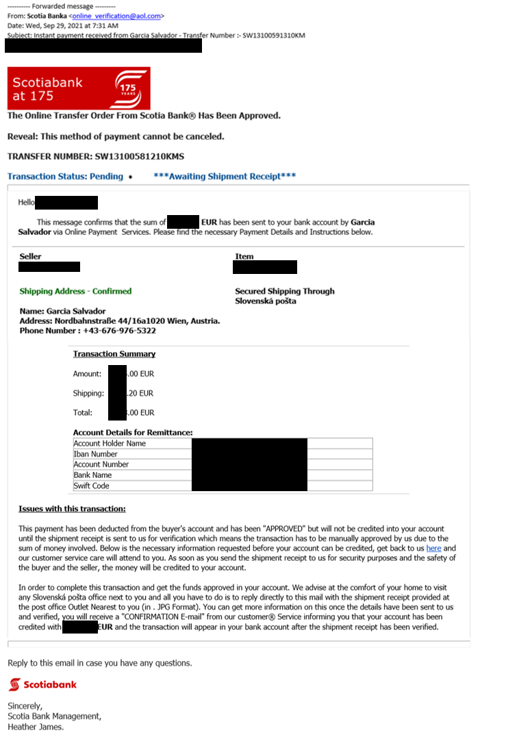 Niektorí útočníci sa ani nesnažia zakryť, že sú zo zahraničia. Práve naopak, snažia sa to využiť vo svoj prospech. Výskumníci spoločnosti ESET zdokumentovali prípad podvodníka, ktorý komunikoval v angličtine a predávajúceho sa snažil presvedčiť, že už za tovar zaplatil. Ako dôkaz poslal snímku obrazovky s fiktívnym potvrdením o platbe, ktorú údajne poslal cez zahraničnú banku ScotiaBank. Tovar žiadal následne doručiť na adresu v Rakúsku.