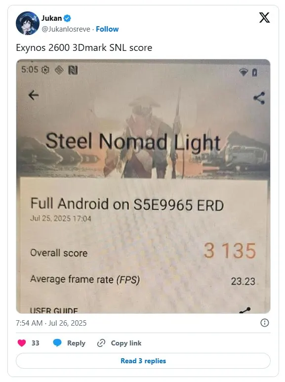 Únik naznačuje, že Exynos 2600 získal v benchmarku 3DMark Steel Nomad Light skóre 3135 bodov, čo je približne o 15 % vyšší výkon než má aktuálny Snapdragon 8 Elite. Ak sa tieto čísla potvrdia, nové GPU Xclipse 960 v Exynose 2600 by mohlo byť najvýkonnejším riešením vo svojej kategórii, aspoň pri syntetických testoch.