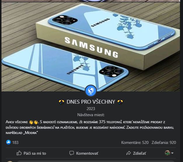 S radosťou oznamujeme, že rozdáme 375 telefónov, ktoré nemôžeme predať z dôvodu drobných škrabancov na plášťoch, budeme ich rozdávať zadarmo. Zadajte požadovanú farbu, napríklad modrá,“ uvádza sa (v češtine) v jedinom príspevku, ktorý je zatiaľ na stránke zverejnený.