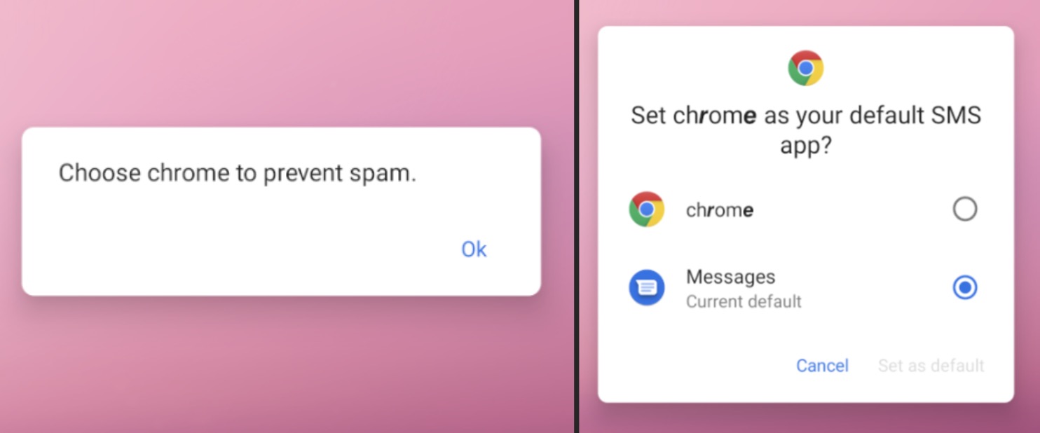 Škodlivá aplikácia sa maskuje tým, že sa vôbec nezobrazí. Namiesto toho si vyžiada nastavenie predvoleného prehliadača Chrome, za ktorý sa chce vydávať. Používateľ tým ale aktivuje aplikáciu, ktorá si následne vyžiada ďalšie oprávnenia. Za skutočne drzé sa dá považovať to, že nastavenie na predvolenú aplikáciu si žiada kvôli ochrane proti spamu.