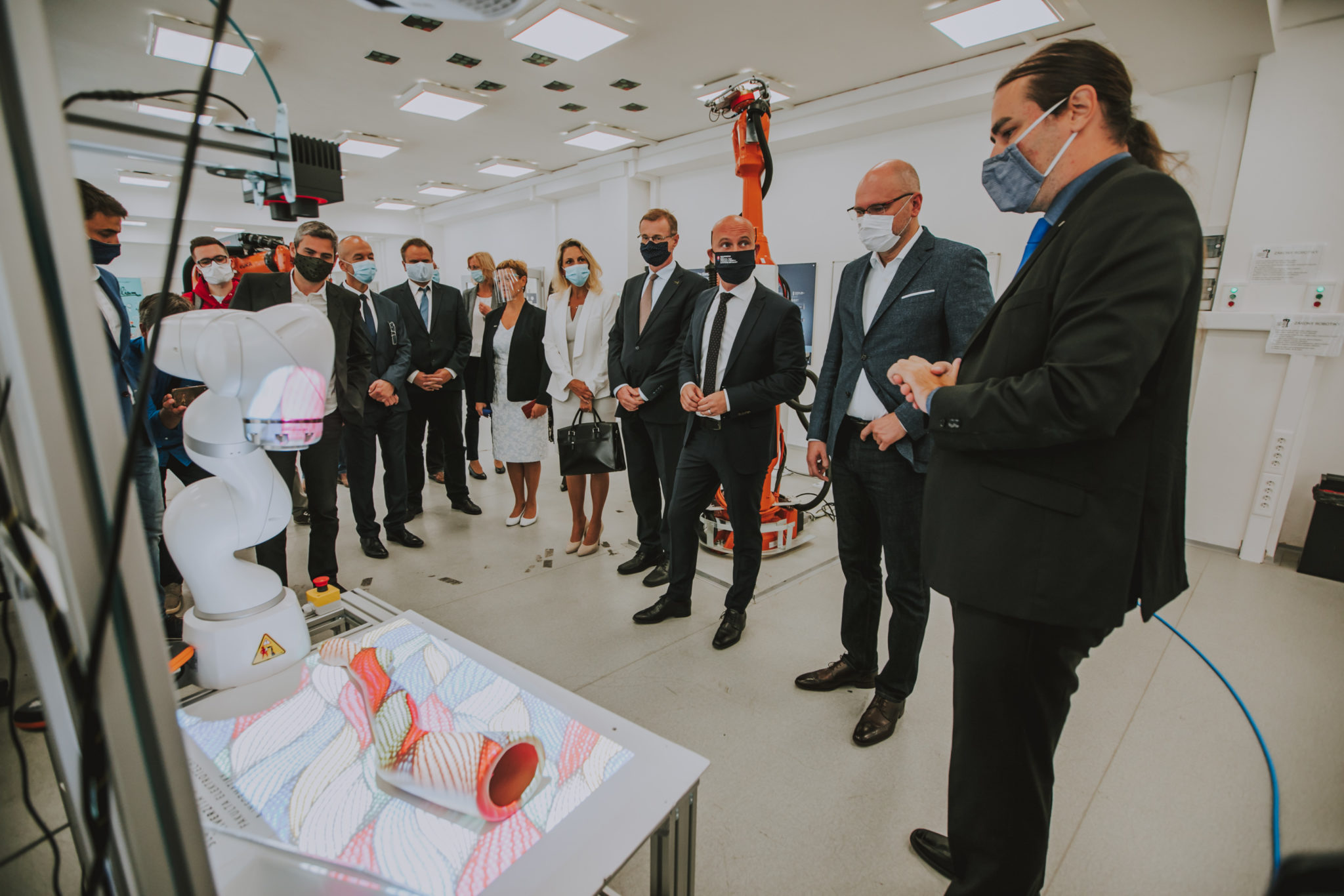 Po otvorení si hostia pozreli niektoré z významných laboratórií FEI STU. Najprv navštívili Národné centrum robotiky, kde im boli predstavené úspešné spolupráce s praxou a excelentné výskumy v robotike. Prvou ukážkou bolo pracovisko na depiláciu v dermatologických klinikách, kde bol predvedený silovo poddajný robot certifikovaný na prácu v medicínskych zariadeniach.