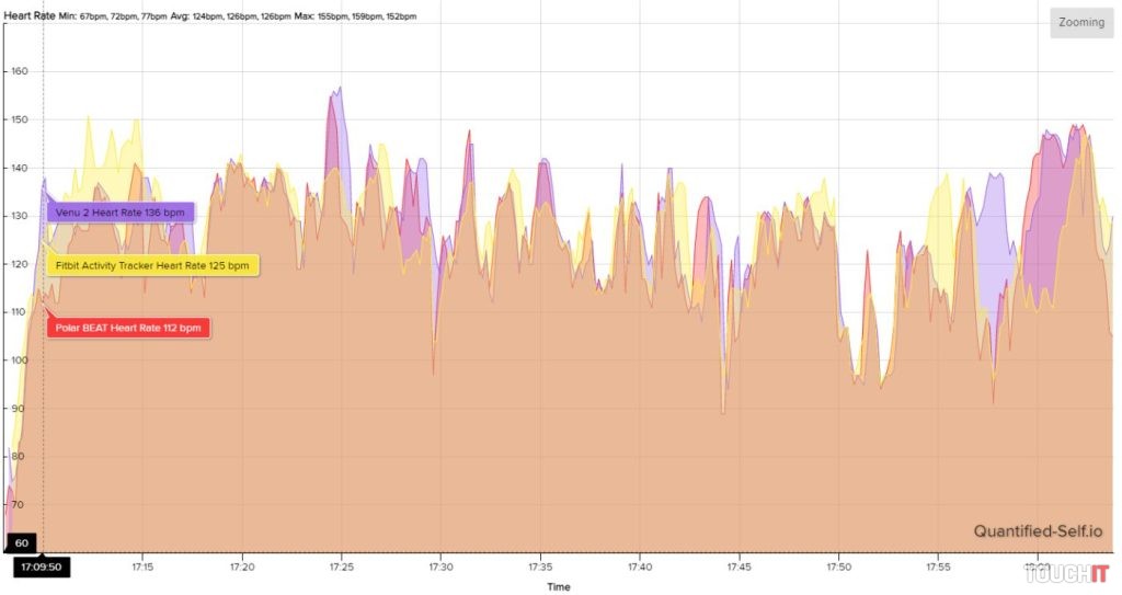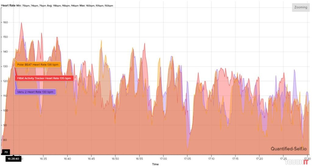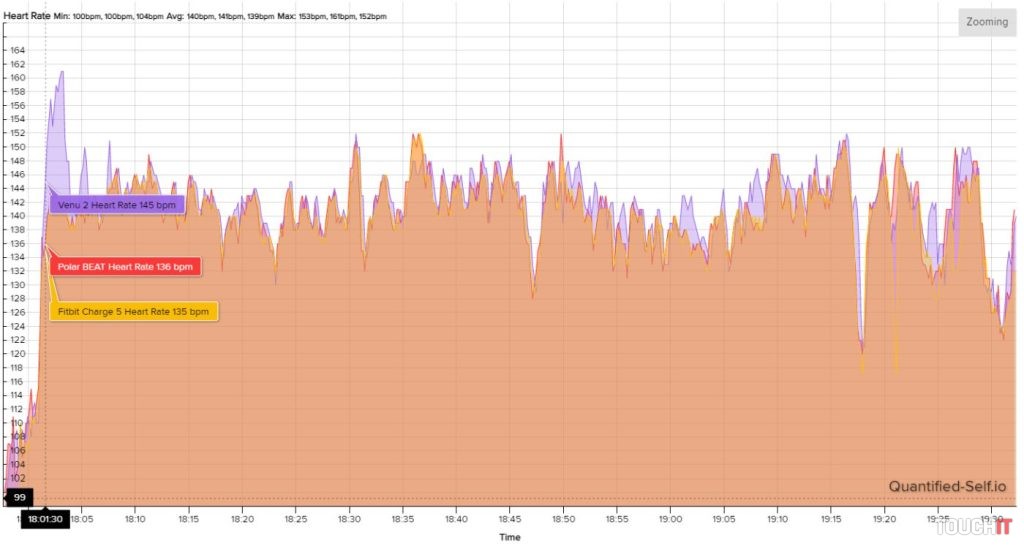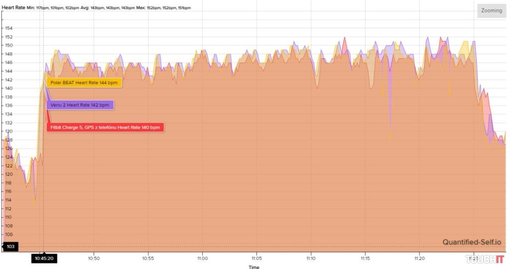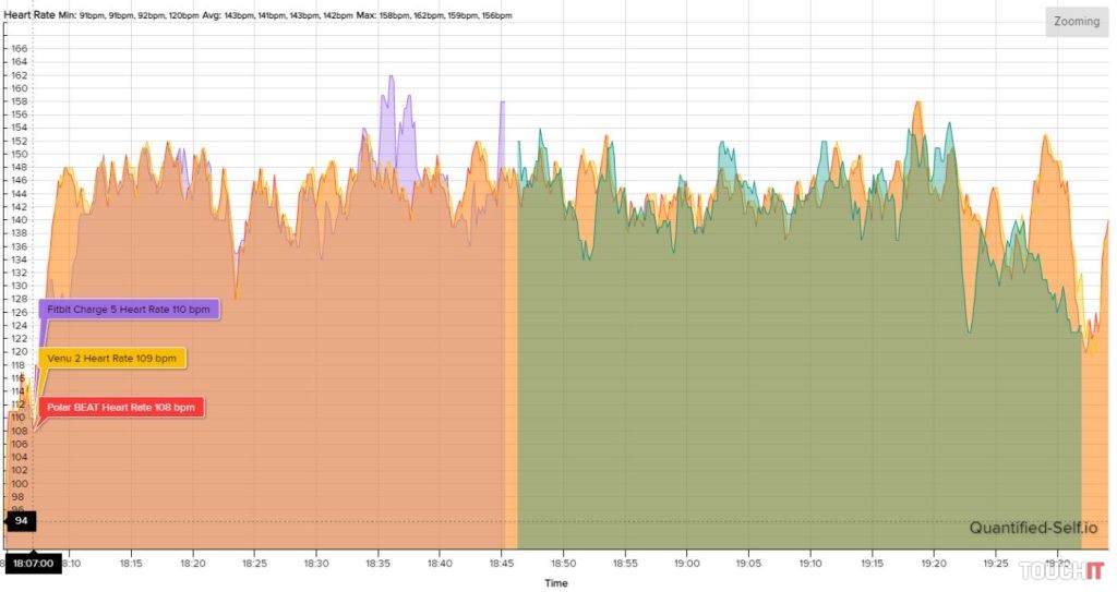 Opäť teda platí, že Fitbit Charge 5 je z hľadiska monitorovania cvičenia určený skôr menej náročným používateľom. Ak sa počas cvičenia chcete držať v tepovej zóne na spaľovanie tukov alebo v kardio zóne, náramok vás na to upozorní a umožní vám kontrolovať tep počas cvičenia s dostatočne vysokou presnosťou. Česť výnimkám, ako sú niektoré HIIT cvičenia, avšak s nimi majú problém prakticky všetky nositeľné zariadenia z hľadiska presnosti tepu počas celej doby cvičenia.