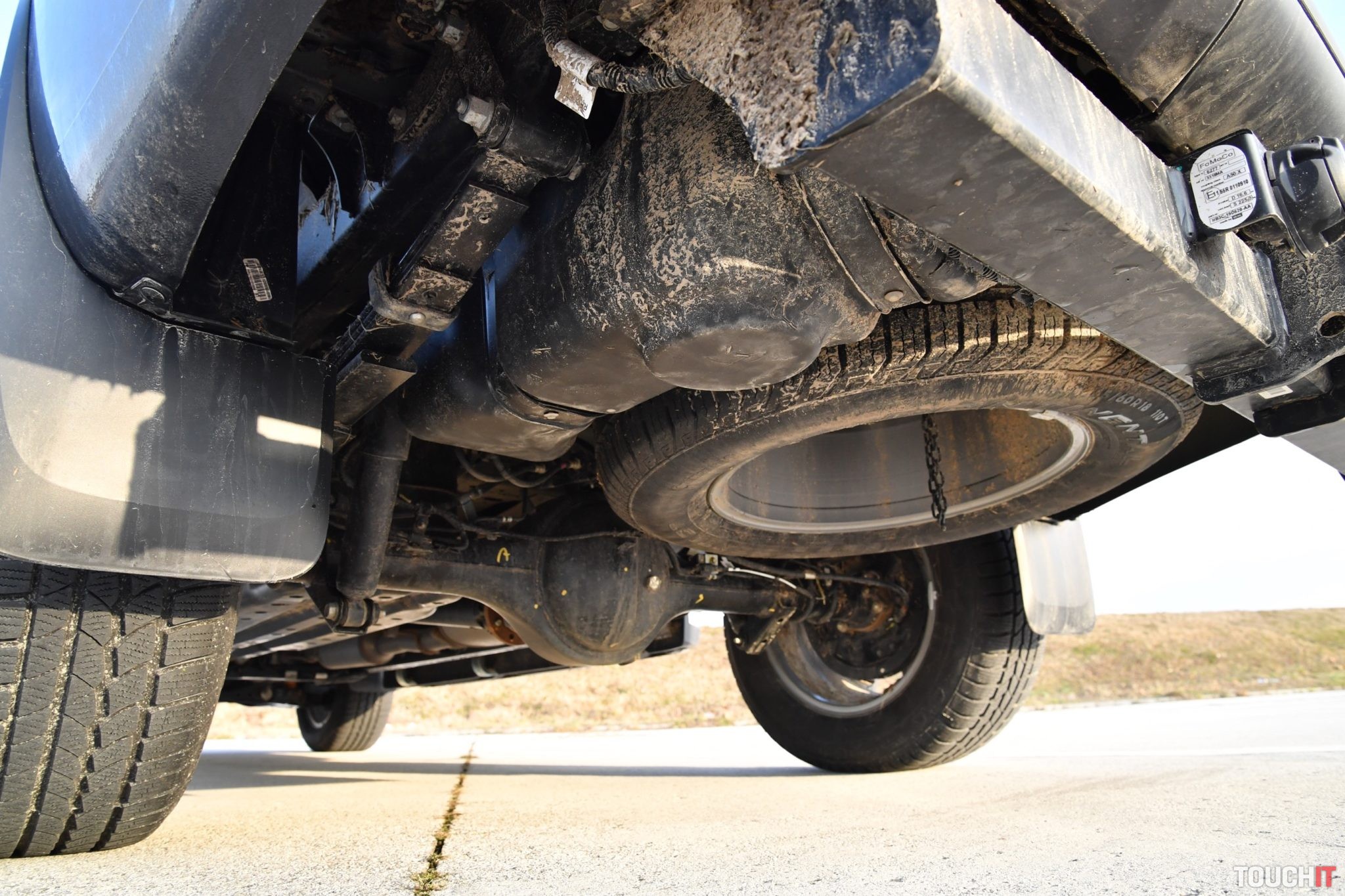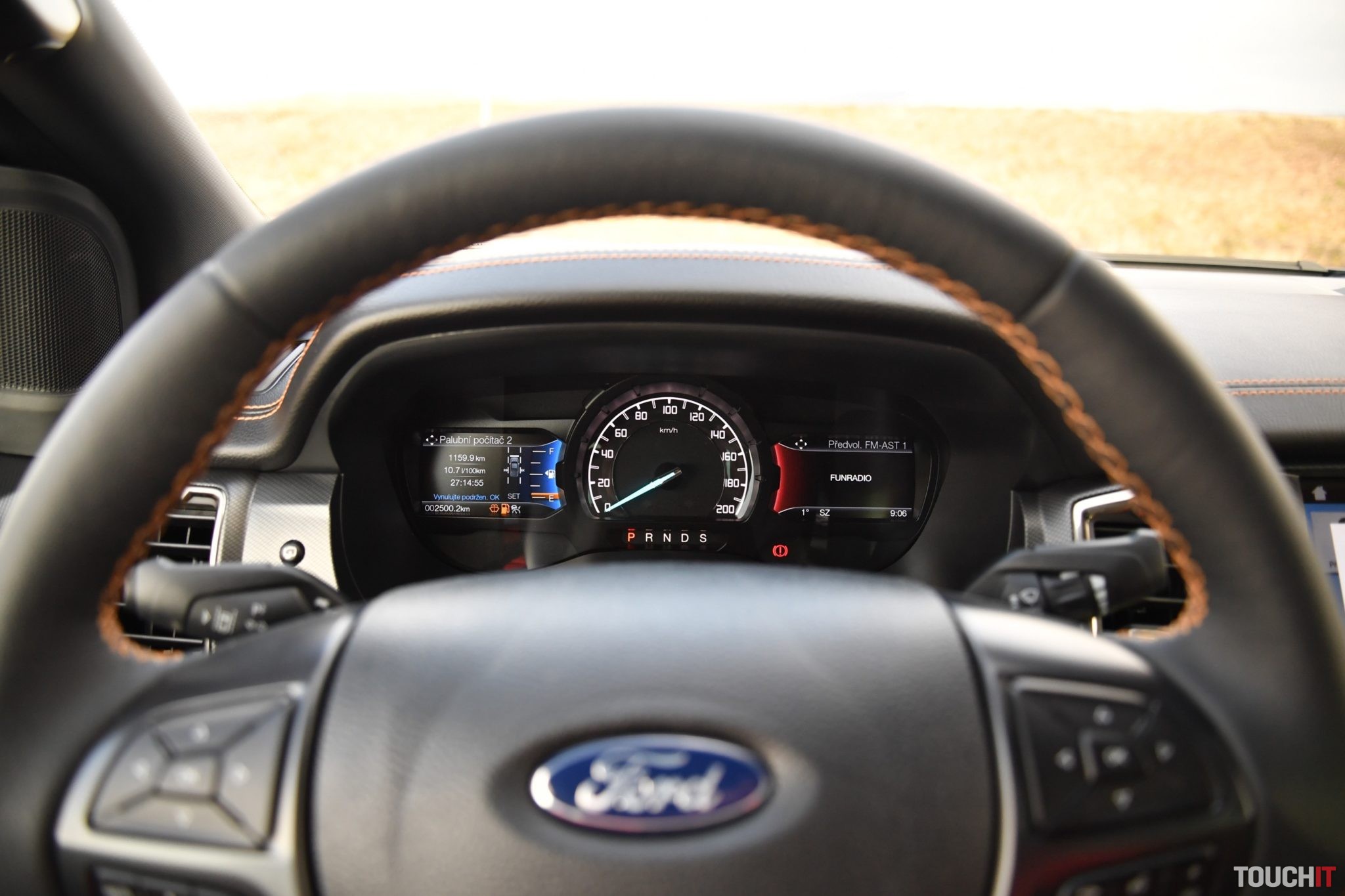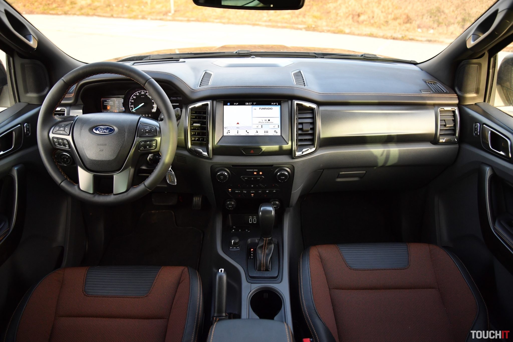 Ešte pár slov k spotrebe. Na začiatku testu, teda počas jázd prevažne v meste som mal priemer 13,6 L/100km. Potom som vybehol na diaľnicu, kde sa spotreba dostala na úroveň 10,4 až 11 litrov – a v tom som celkom dobre pokračoval aj po zvyšok týždňa. Počas jazdy v teréne opäť stúpla vysoko, ale celkový priemer za 7 dní sa ustálil na hodnote 11,4 L/100 km. Áno, nie je to málo, ale treba si uvedomiť, aký motor toto 2-tonové auto poháňa a akú má silu a predispozíciu zdolávať ťažký terén, odviesť na korbe viac ako 1 tonu a ťahať 3,5 tonový. Terénne schopnosti a technické dáta odľahčím technologickou výbavou a asistenčnými systémami, ktorých je tu viac než dosť. Fungujú prekvapivo dobre a keby čítate len tento odsek, tak asi netušíte, že píšem o výbave pracovného tanku, ktorý vyzerá najlepšie vtedy, keď má po obvode karosérie 5 cm blata rôzneho druhu J. Okrem bežných prvkov, ako je 2-zónová automatická klimatizácia, vyhrievanie predných sedadiel, vyhrievanie čelného/zadného skla a dvoch 12V zásuviek vpredu + 1 vzadu sa tu nachádza aj výborný informačno-multimediálny systém Sync 3. V strede palubnej dosky je osadený 8“ dotykový LCD displej.