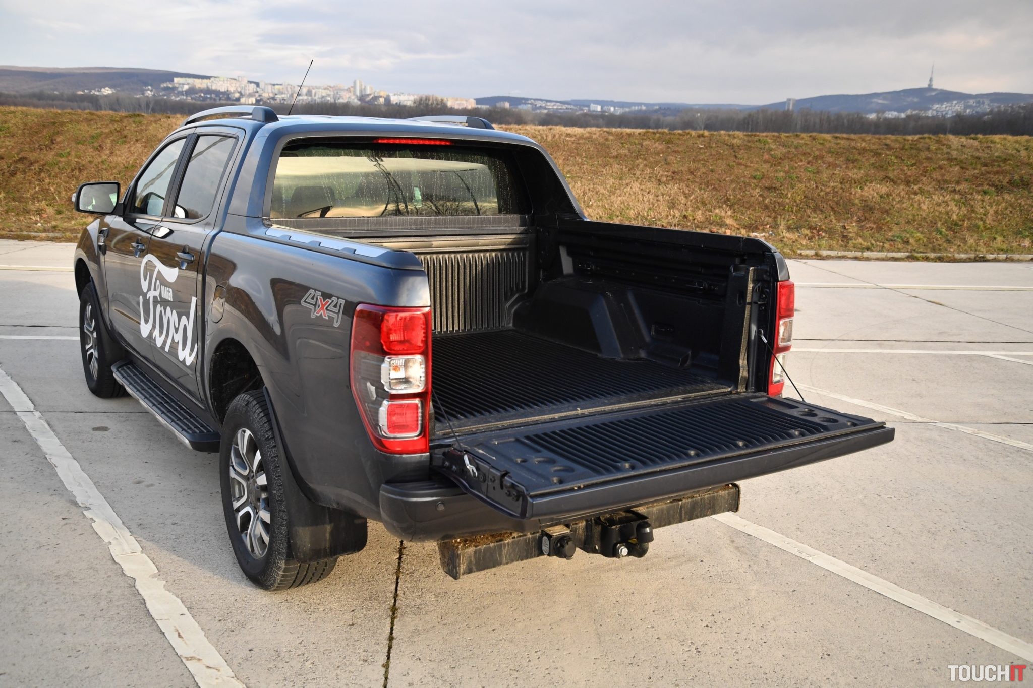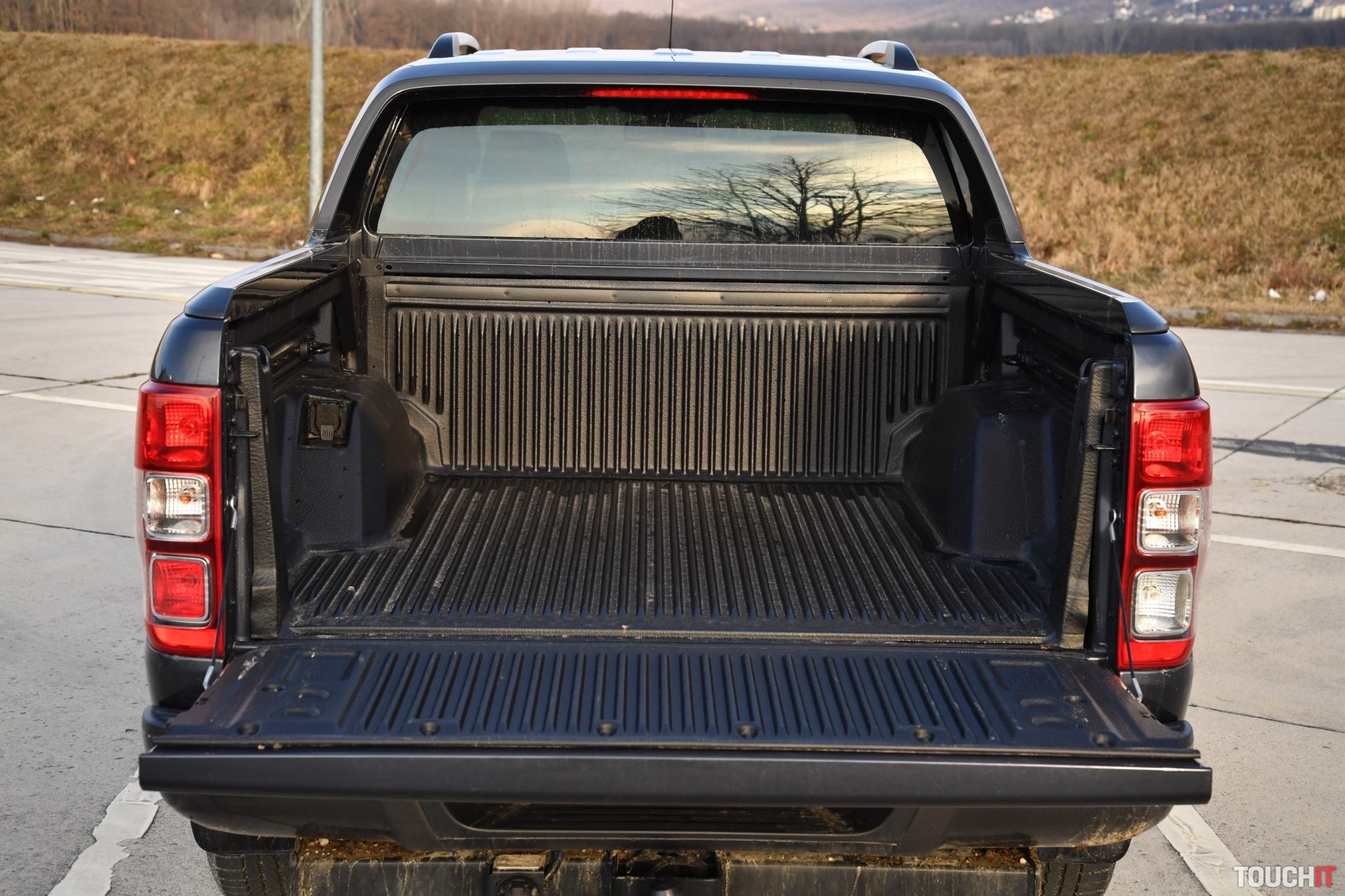 Keďže ide o vyhotovenie DoubleCab, tak tu majú svoje miesto aj zadní pasažieri. Tí sa budú cítiť podľa toho, po akom povrchu bude auto prechádzať. Podvozok nie žehlička a vzadu to cítiť, najmä ak je ložný priestor úplne prázdny (ľahký). Dá sa tu však vydržať a sedieť aj počas dlhej cesty. Veľký komfort tu síce zažívať nebudete, ale je to použiteľné na každodenné vozenie ľudí. Zadná časť trpí kvôli lavici, ktorá je tvarovo dobre vyhotovená, ale sklon operadla a dĺžka sedadiel je iba priemerná. Vrchná časť tvorí jeden celok, ktorý sa dá sklopiť. Za operadlom je natívne povinná výbava. To platí aj pre sedadlá, ktoré tvoria jeden kus, ktorý sa dá zdvihnúť a prenášať tak v kabíne objemnejšie bremená. Po zdvihnutí sa vám sprístupnia aj dva otvorené odkladacie priečinky v podlahe. Batožinový priestor nie je, čo je občas prekážkou (za príplatok sa dá rôzne nakonfigurovať podľa potreby), ale je tu ložná plocha, ktorá je dobrým sluhom pri práci. Má rozmery 2317 (d) x 1560 (š) x 511 (v) mm. To je celok, pričom medzi blatníkmi je šírka 1139 mm. Výška nakladacej hrany je 724 mm. Korba je lemovaná odolným plastom, k dispozícii sú koľajnice s posuvnými okami a nájdete tu aj krytú 12V zásuvku, čo je výhodou. Aerodynamická a zároveň esteticky úhľadne spracovaná nadstavba má integrované 3 brzdové svetlo a 2 malé (pracovné) LED svetlá. V noci tam aspoň niečo vidieť. Zadné dvere sú celkom ťažké, majú klasické otváranie a nosnosť viac ako 100 Kg. Ak by bola prítomná plynová vzpera, tak by bolo otváranie jednoduchšie. Spomenúť musím aj ťažné zariadenie inštalované vo výrobe, ktoré je pri tomto type vozidla veľmi dôležité. Ranger môže ťahať 3,5 brzdený príves a prítomná je aj technológia TSC – Stabilizačný systém pri ťahaní prívesu.